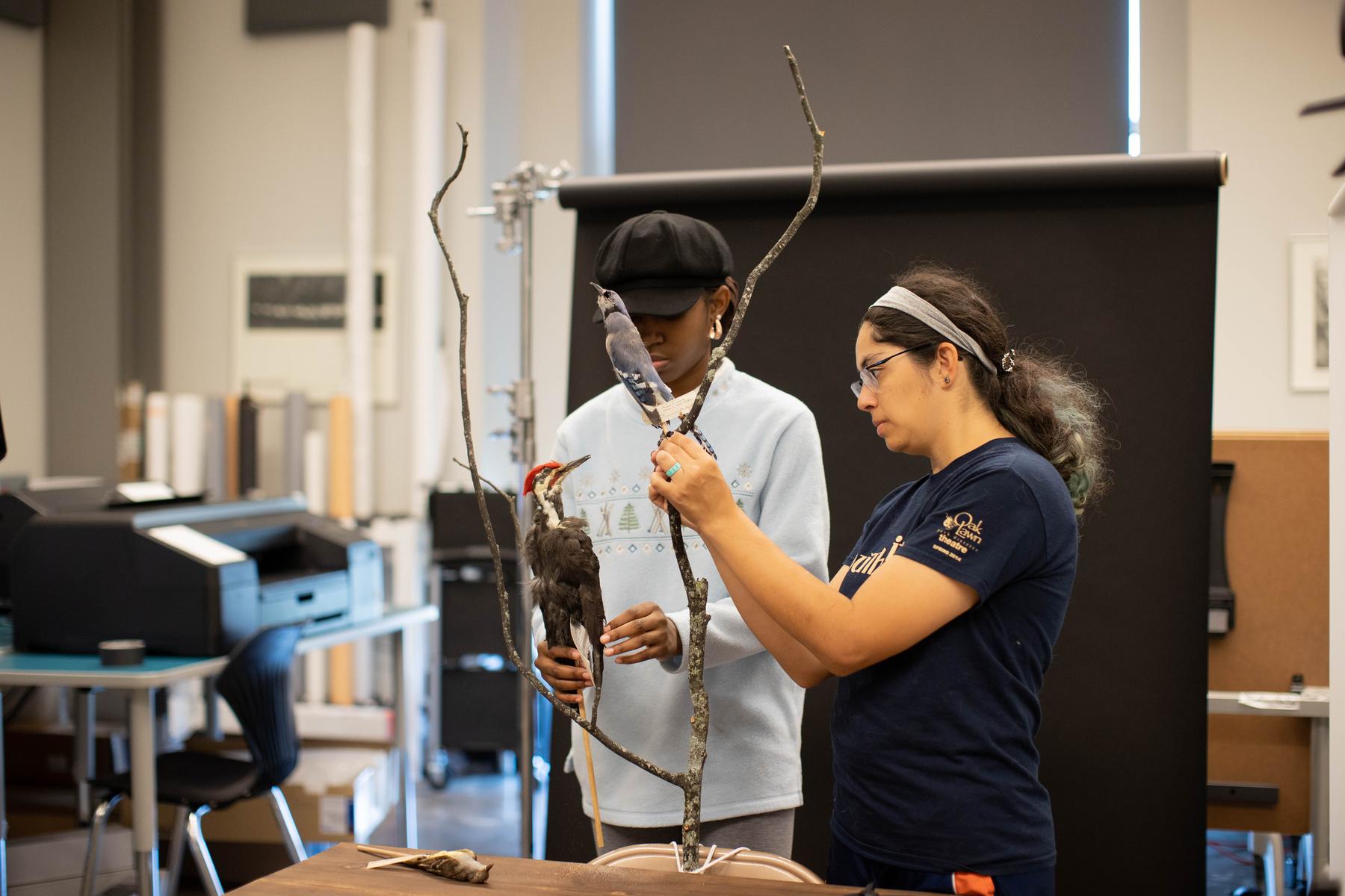 Students Erica Keane and Jordyn Jones teamed up to work on one of the photo shoots, one featuring a trio of bird specimens – a pileated woodpecker, a great crested flycatcher and a blue jay.