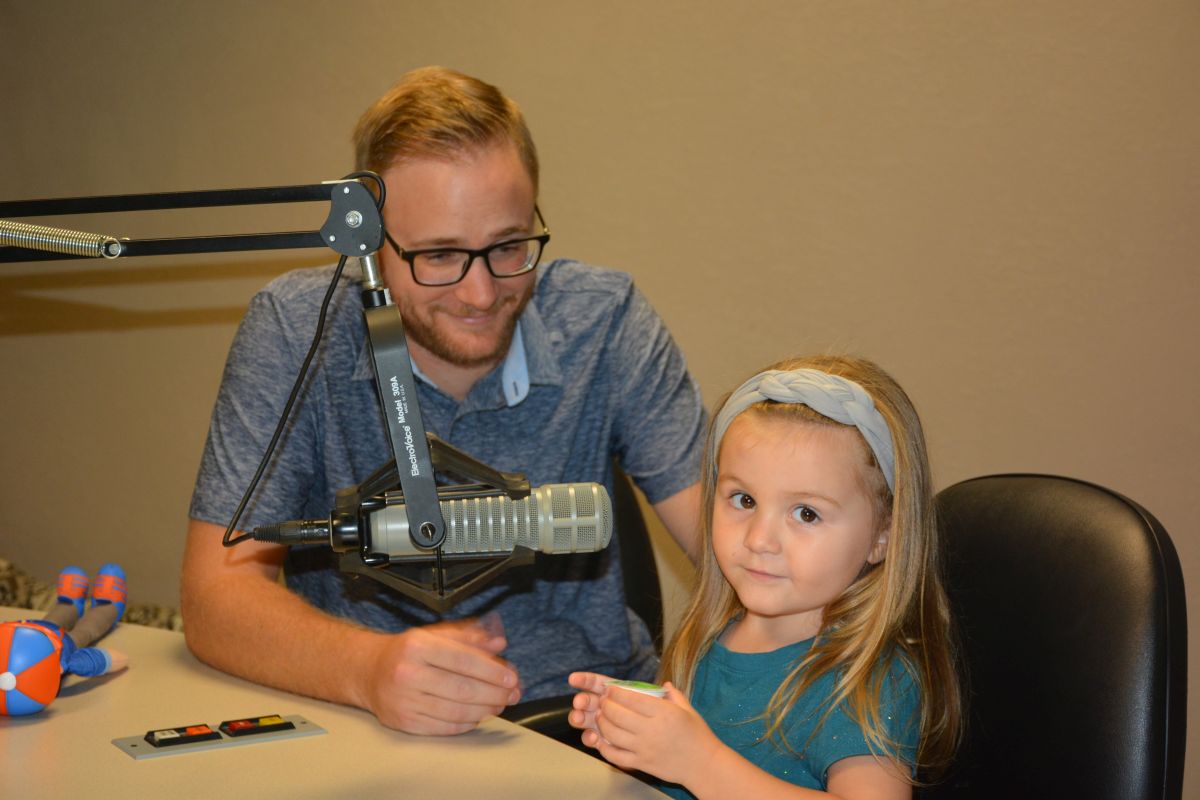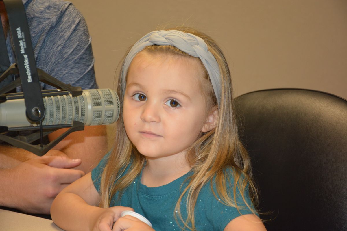 Layla Breil and her dad Brenden on Beaver Country 100.3 with morning air personality Chris Brooks talking about the Blippi in my Hometown contest on Fri July 8, 2022. (Lee Erwin)