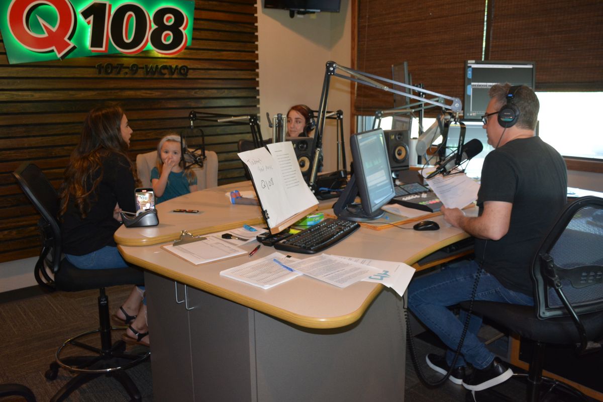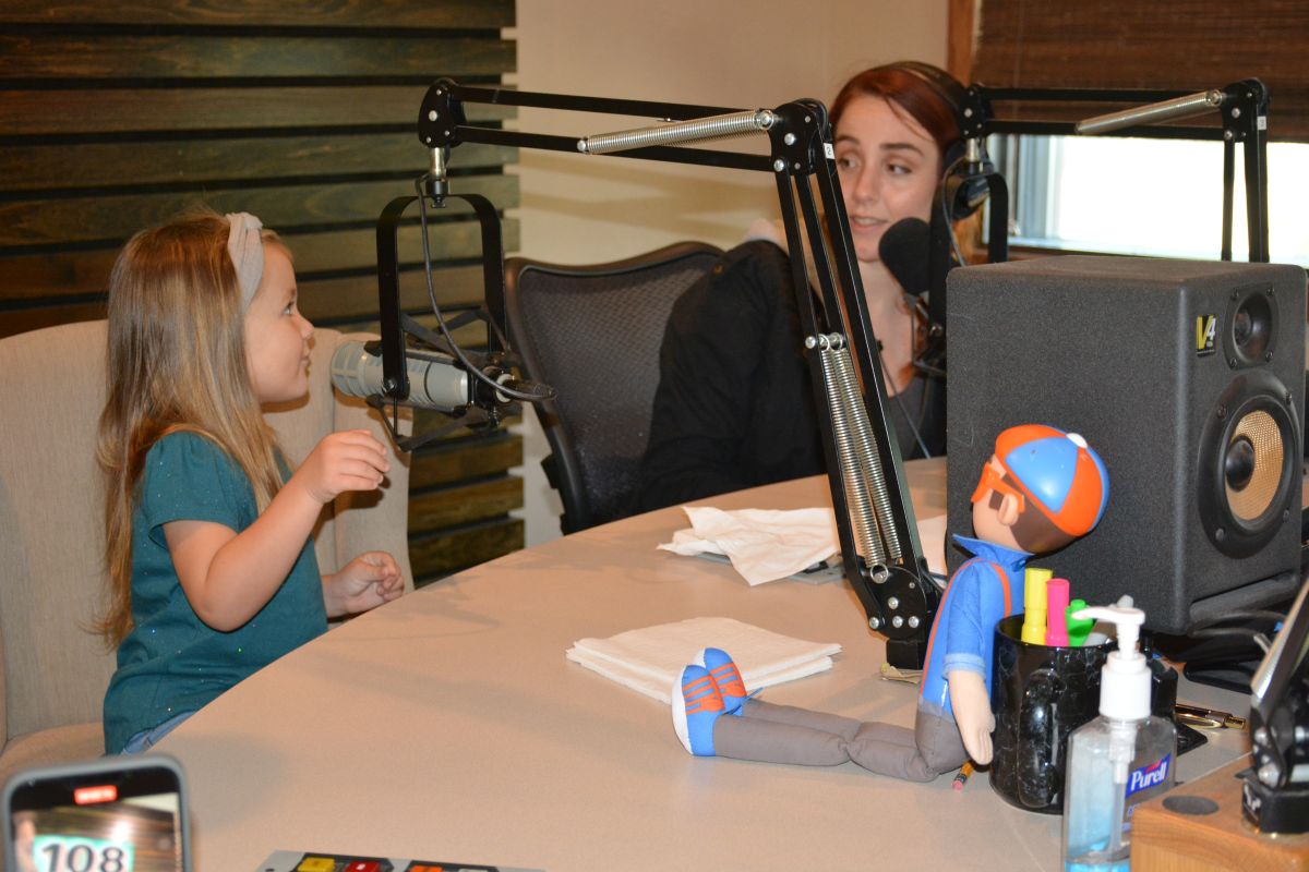 Layla Breil and her mom Lauren on Q108 with morning air personalities Tommy Jordan and Katie Jay talking about the Blippi in my Hometown contest on Fri July 8, 2022. (Lee Erwin)