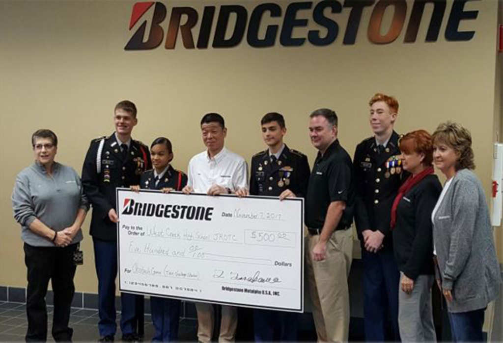 CLARKSVILLE, Tenn. (CLARKSVILLENOW) – On November 7, the leadership of Bridgestone Metalpha U.S.A., Inc. donated $500 to assist in developing a long sought after confidence course on the campus of West Creek High School.