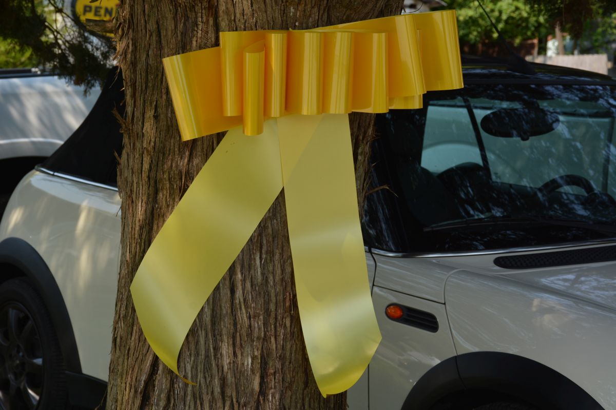 A yellow ribbon is placed on what will be known as the Giving Tree at the Butterfly Moments ribbon cutting for a new veterans housing and recovery center at 2088 N. Ford Street in Clarksville on Sunday, July 4 2021 (Lee Erwin).