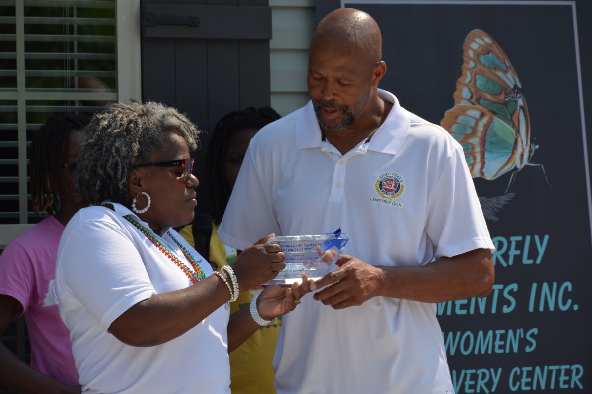 L-R, Mary Laremore, Butterfly Moments Inc. Founder presents an award to Bert Singletary at the Butterfly Moments ribbon cutting for a new veterans housing and recovery center at 2088 N. Ford Street in Clarksville on Sunday, July 4 2021 (Lee Erwin).