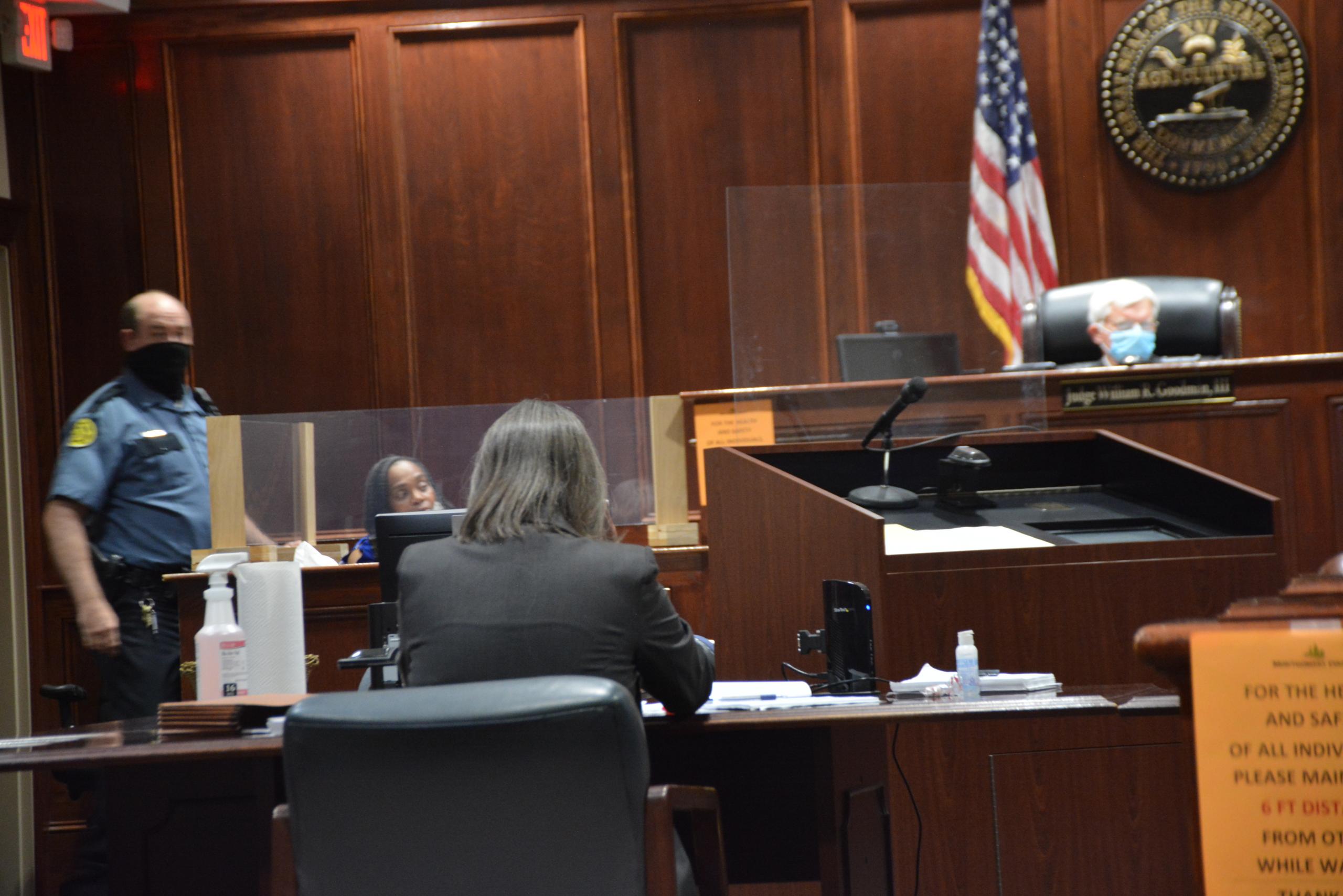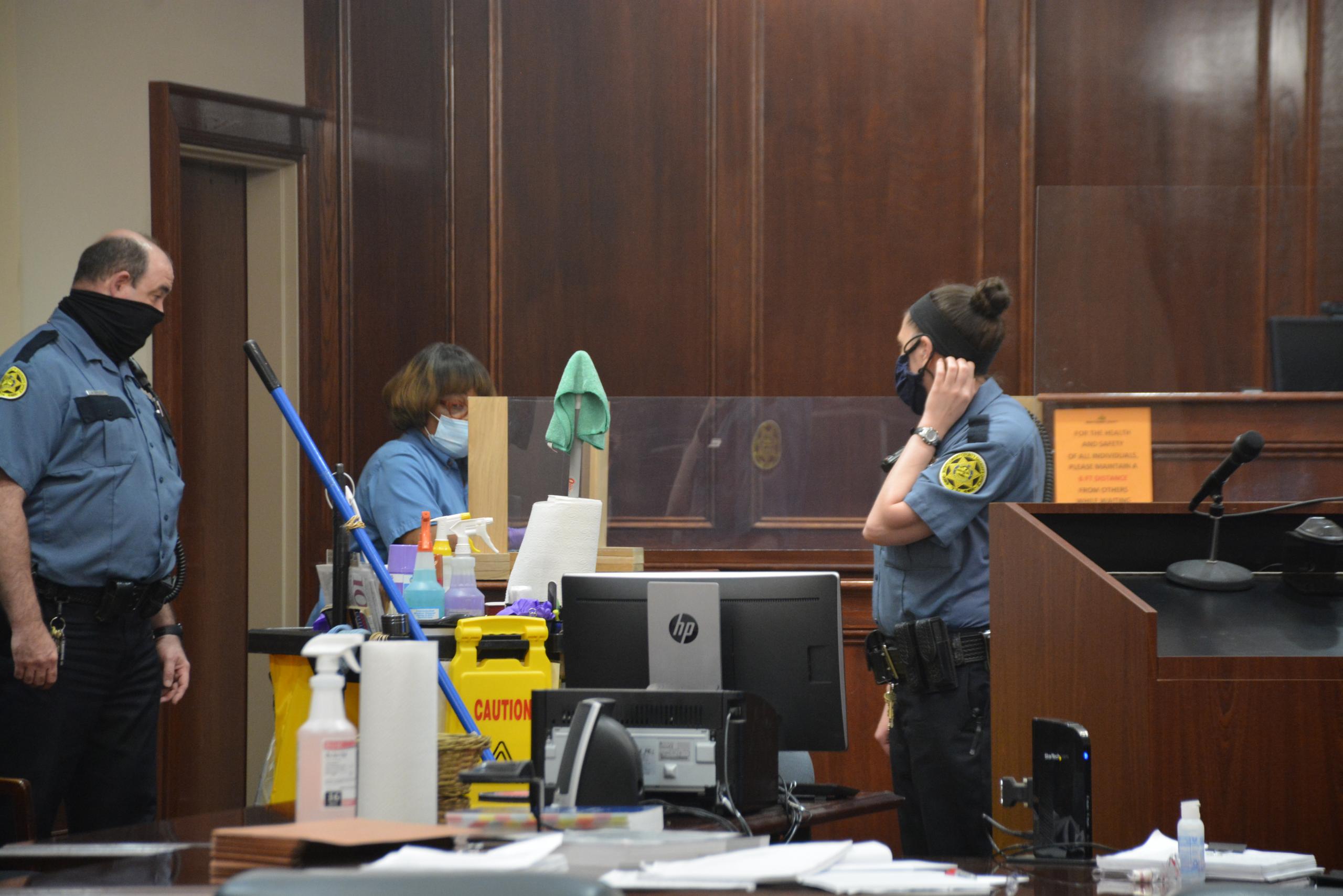 The masked jury was seated every other seat, as well as in front of the jury box and on an additional bench next to the jury box. Large plastic shields were previously installed in front of the witness stand, presentation podium and judge’s seat. In between each witness that testified, a maintenance worker came in to disinfect the witness stand before the next witness was called.