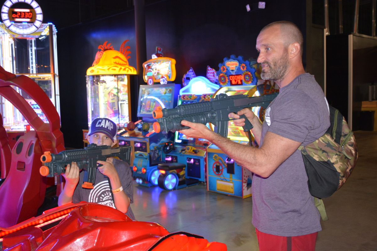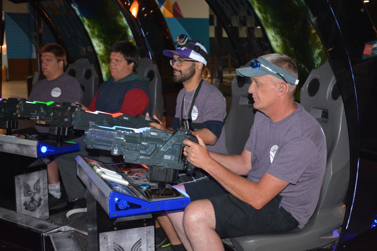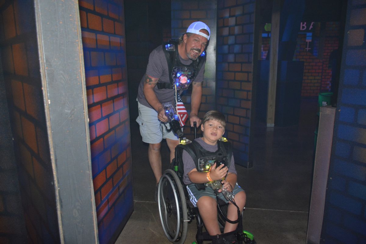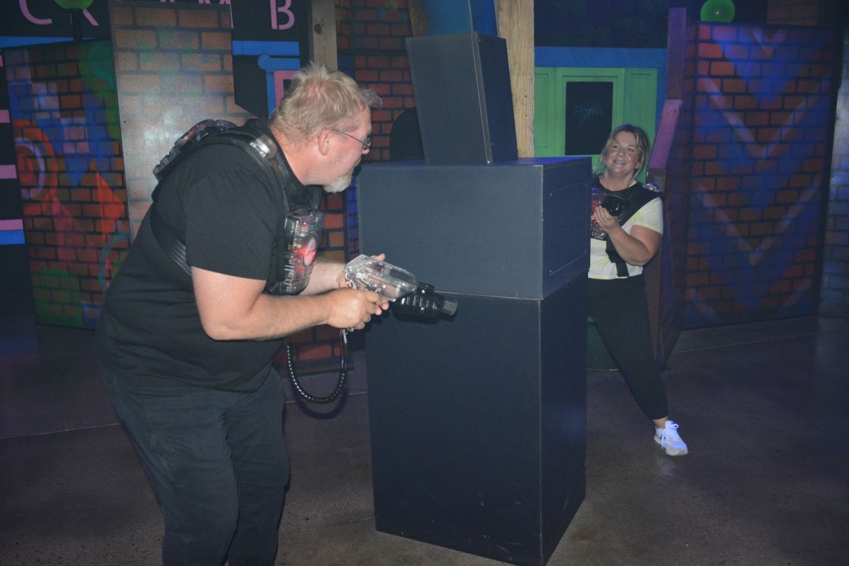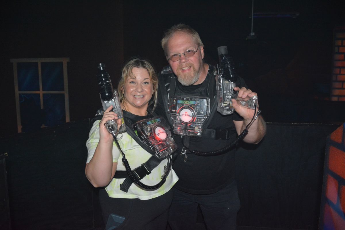 Fletch and Mandi, Beaver 100.3 morning air-personalities get into a game of laser tag at The City Forum for Clarksville Camp Rainbow on Wed June 16 2021 (Lee Erwin).