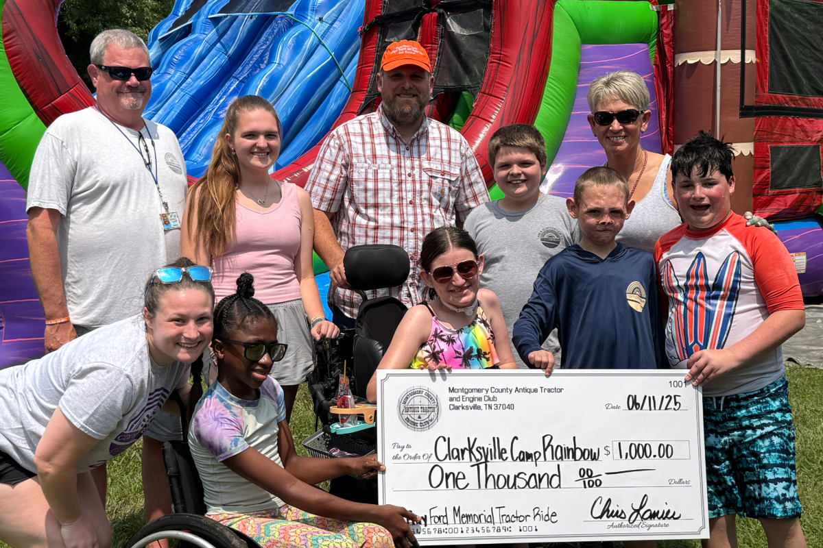 Christopher Lanier, presents Clarksville Camp Rainbow with a check on behalf of The Montgomery County Antique Tractor and Engine Club on June 11, 2025. (Jamie Peltz)