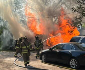 A large shed behind homes on Seventh Street burned down Thursday morning.
