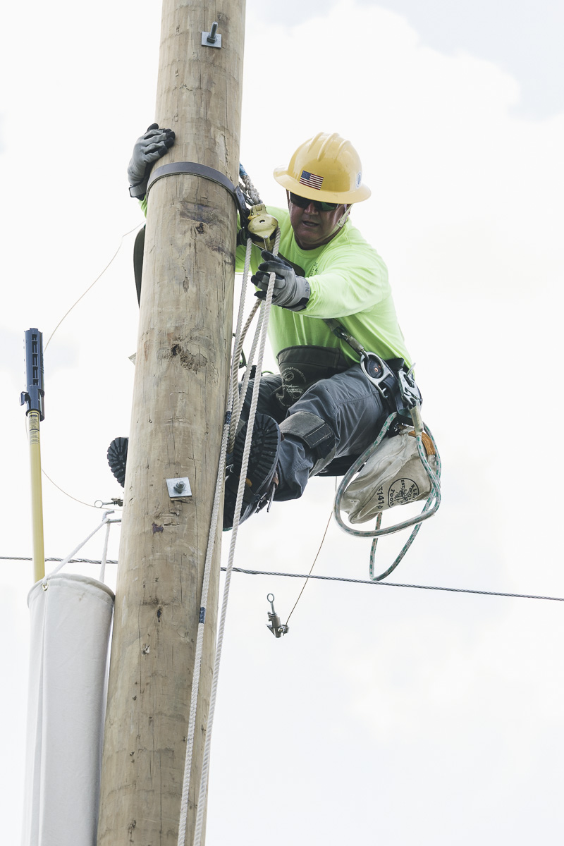 Linemen competed to accomplish tasks at the top of poles set up in the park for the occasion.
