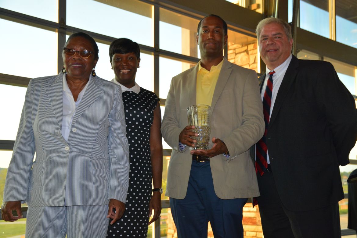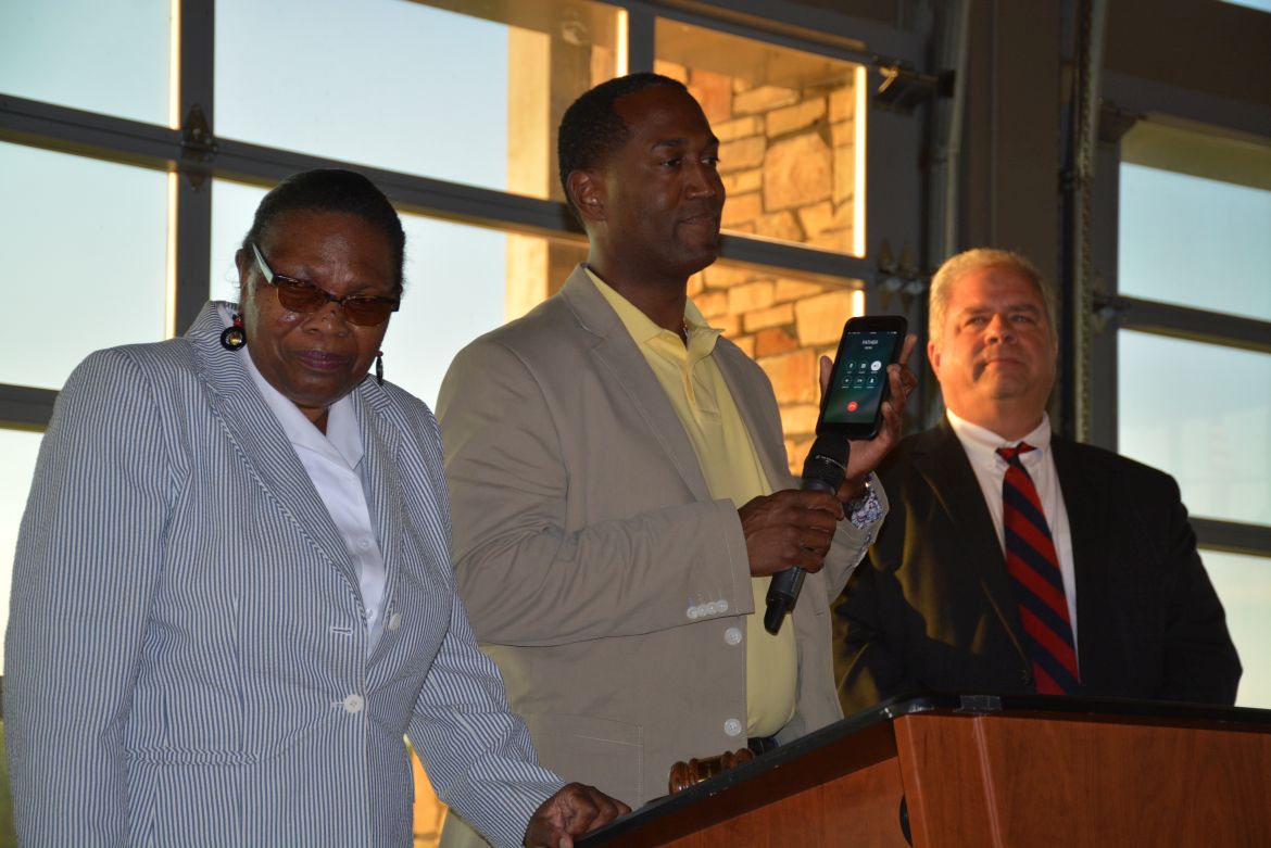 The Lifetime Achievement Award is given to a Chamber member that has shown dedication to the Chamber and the community. The honor went to Pastor Jimmy Terry, who unfortunately could not be at the Gala. His son Jimmy Terry Jr. accepted the award for him and called his father while on stage to have him talk to the crowd through the phone held up to the microphone.