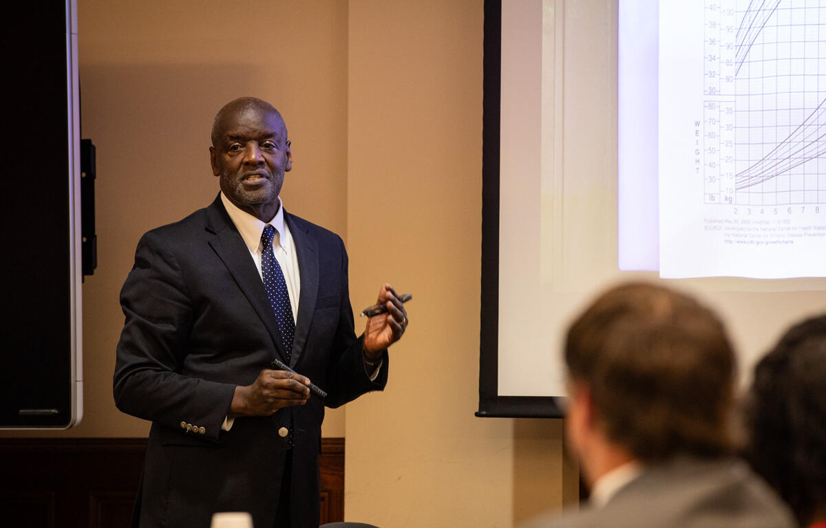 “If we plot that on a growth chart … he’s below what we call the 5th percentile,” Griffieth explained. He was then invited up to describe using a copy of the CDC growth chart on the projector screen. “So, you’re comparing your child against other kids the same age, and then over time, you’re comparing the kids against themselves. … But again, remember, kids with CP don’t grow very well, and that is not that unusual. What I need is a second point, because then that tells me what the rate is.”