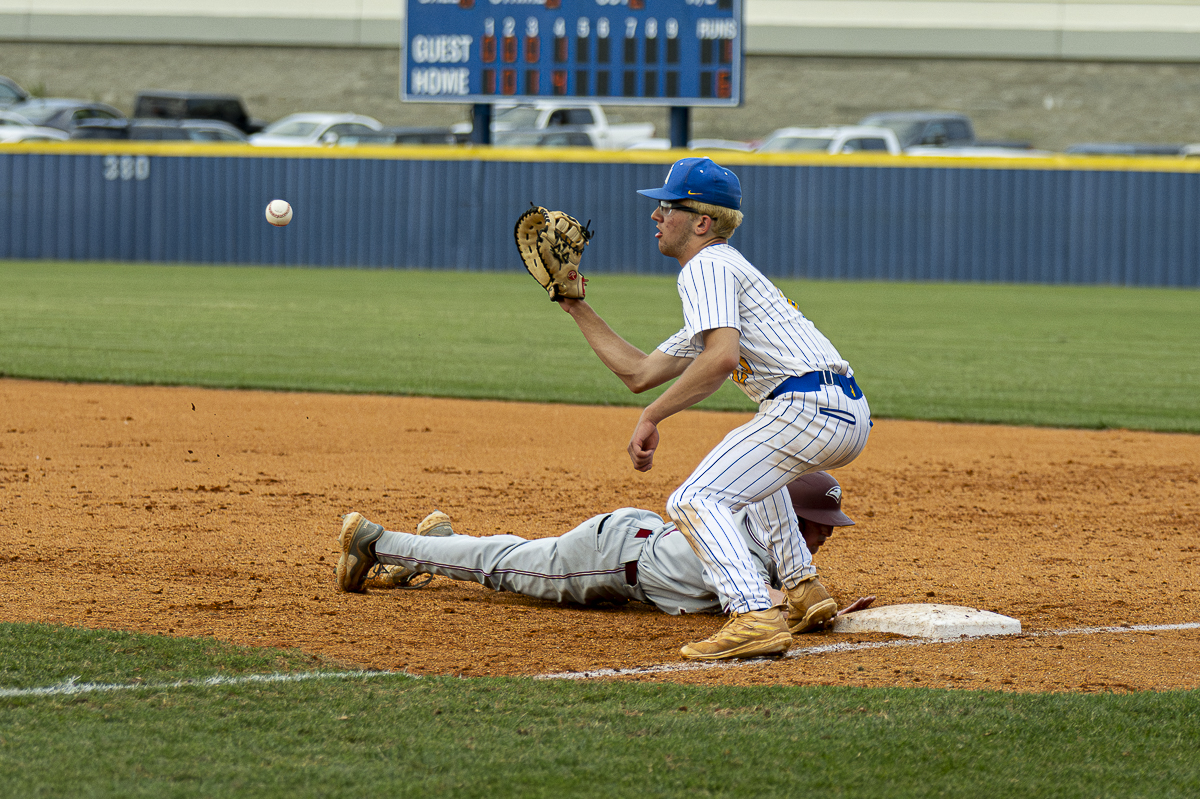 #22 Jaylen Page of the Clarksville Academy Cougars makes the catch at first base against Evangelical Christian in the Regional Finals on May 14, 2025 (Jeff Danault)