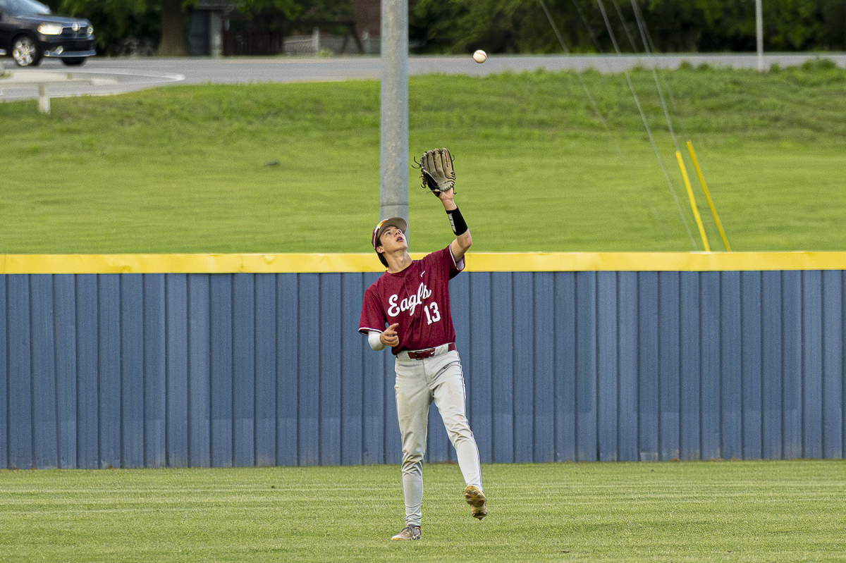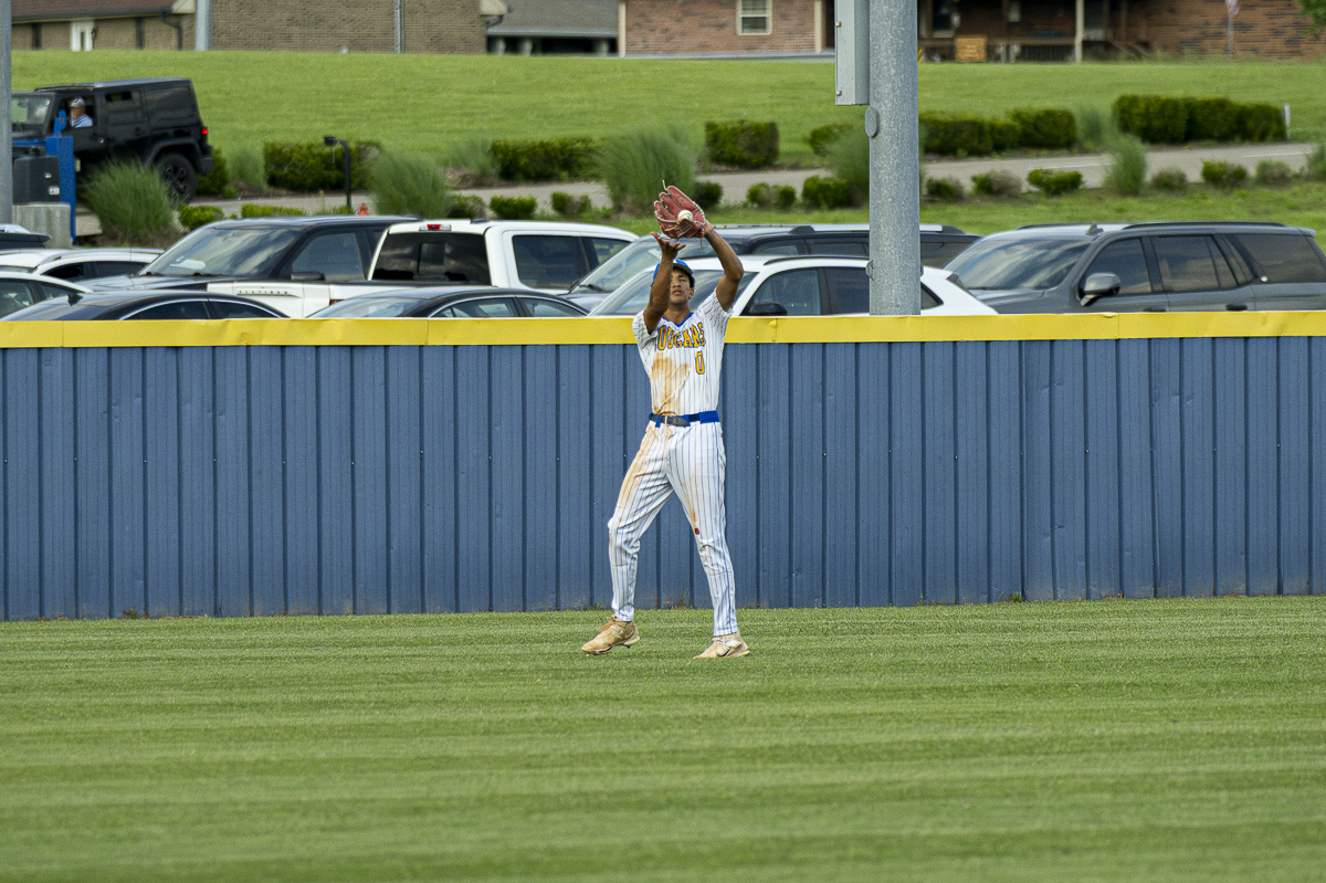 #13 Henry Crosby of Evangelical Christian makes the catch in left field against the Clarksville Academt Cougars in Game two f the Regional Finals on May 14, 2025 (Jeff Danault)
