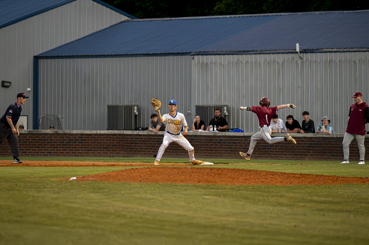 #22 Jaylen Page of the Clarksville Academy Cougars makes the play at first base against Evangelical Christian in the Regional Finals on May 14, 2025 (Jeff Danault)