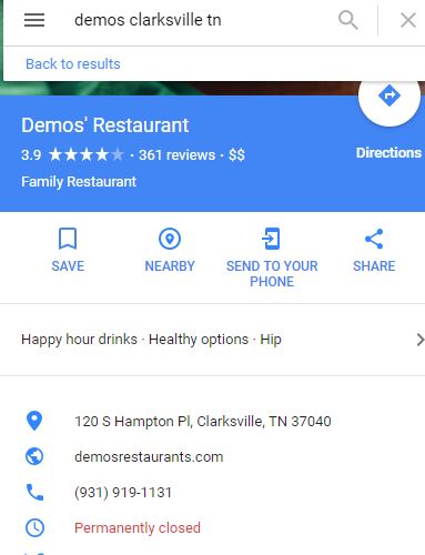 A search for Demos’ of Clarksville on Google showed that the restaurant is listed as ‘permanently closed’ and has been removed from other listings.