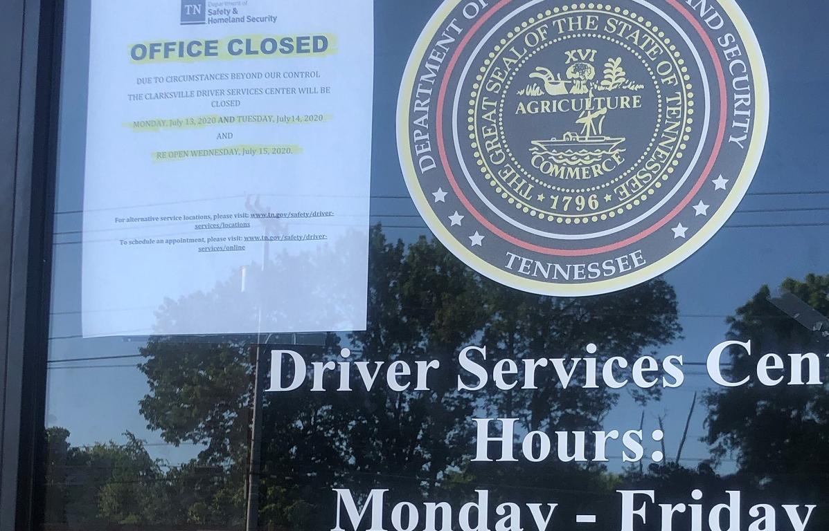 A sign on the door, said “Due to circumstances beyond our control the Clarksville Drivers Center will be closed on Monday, July 13 and Tuesday, July 14 and reopen Wednesday, July 15.”