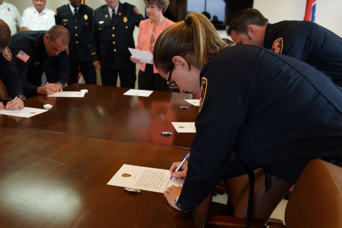 The new recruits just completed six weeks of extensive training which included 240 hours of basic firefighter training, CPR, first aid, hazardous materials and defensive driving. After the swearing-in ceremony, friends and family were invited back to the training facilities to witness the recruits’ last training evolution (live fire evolution).