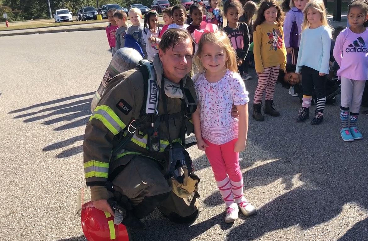On his day off, Lt. Ronnie Shepard wanted to surprise his granddaughter, Catherine, a kindergartner at the school. He dressed in full gear.