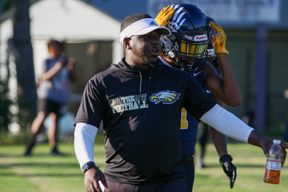 Seven on seven is pass-only football, focusing on route combinations as well as defensive backfield coverages. It’s designed to prepare skill players for what they will see in the fall, as well as get in some good practice against competition. Northeast first year head coach Deonte Weston thinks that seven-on-seven is extremely helpful for his new squad leading into the 2024-25 season.