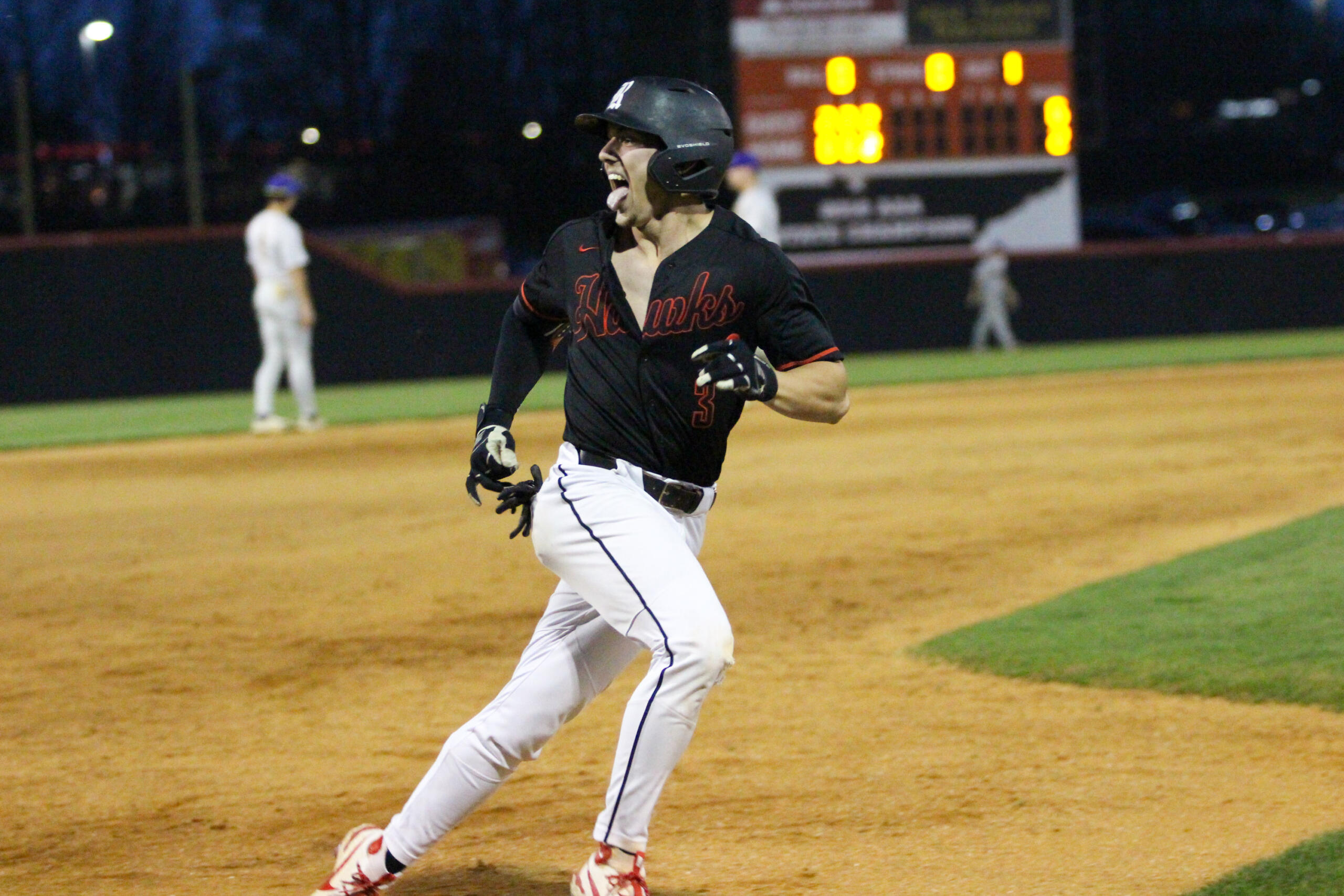 A few innings later, in the bottom of the fifth, the Hawks scratched three more runs across the plate to tie the game. With a 1-2 count, two outs, and the bases loaded, right fielder Jordan Akins awaited the pitch that never came, as the game was suspended and eventually postponed due to the weather.