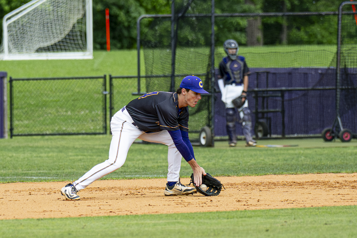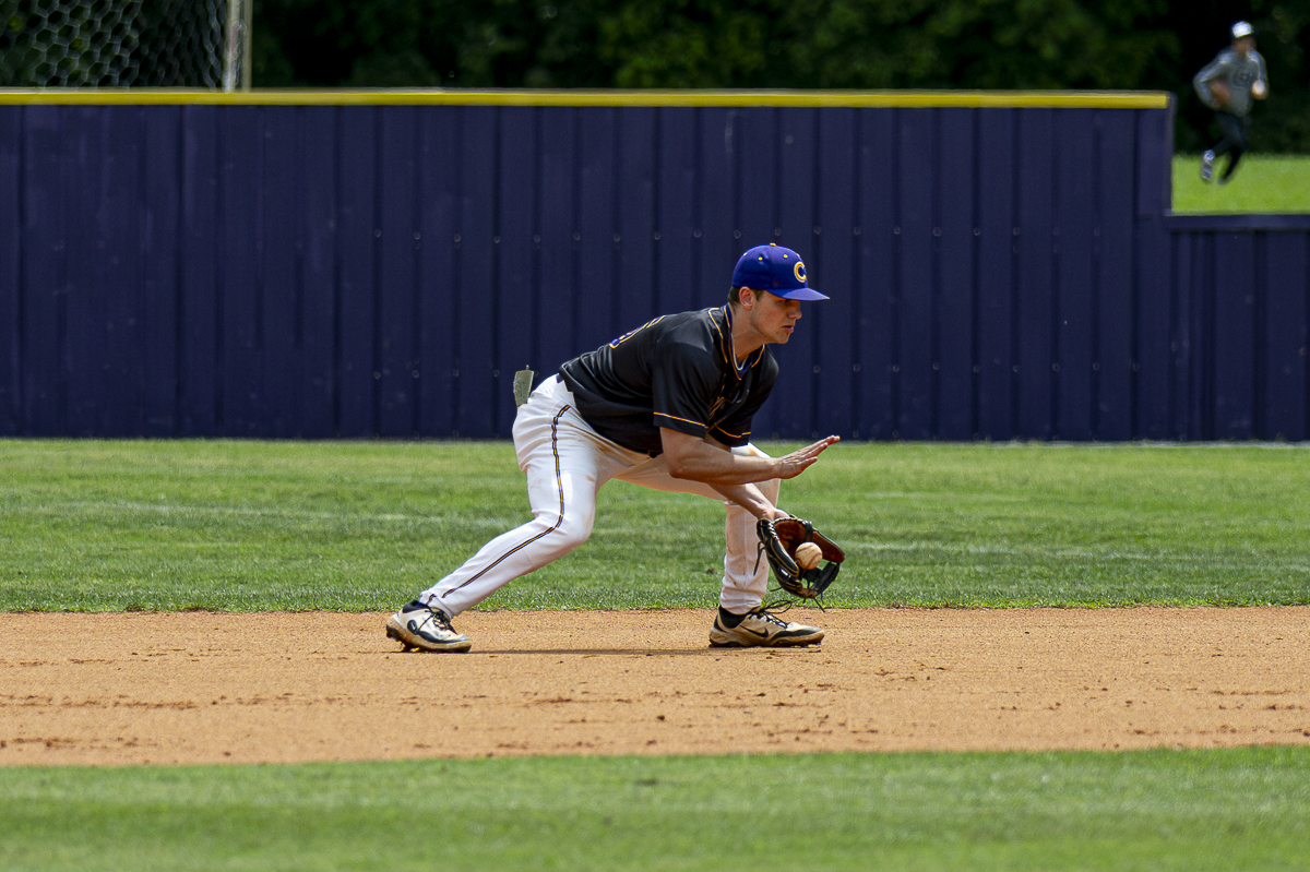#25 Kirk Weatherford of the Clarksville High Wildcats makes the infield play against the Kirkwood Cobras in the District Semifinals on May 4, 2025 (Jeff Danault)