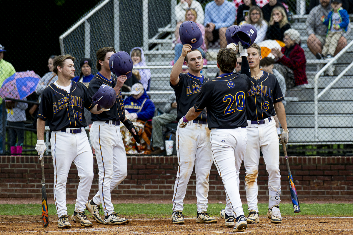 #20 Cane Abernathy of the Clarksville High Wildcats greeted by his teamates after crushing a 3 run homerun against the Kirkwood Cobras in the District Semifinals on May 4, 2025 (Jeff Danault)
