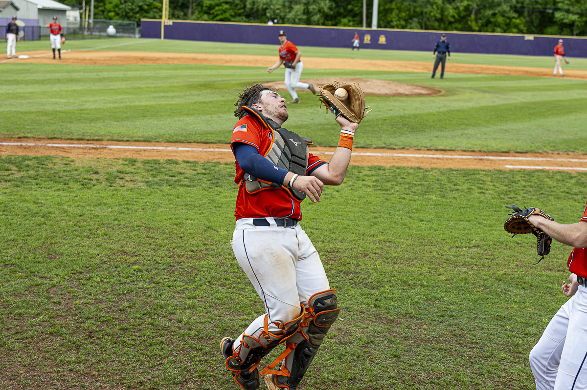 #7 Andrew West of the Kirkwood Cobras makes the catch against the Clarksville High Wildcats in the District Semifinals on May 4, 2025 (Jeff Danault)