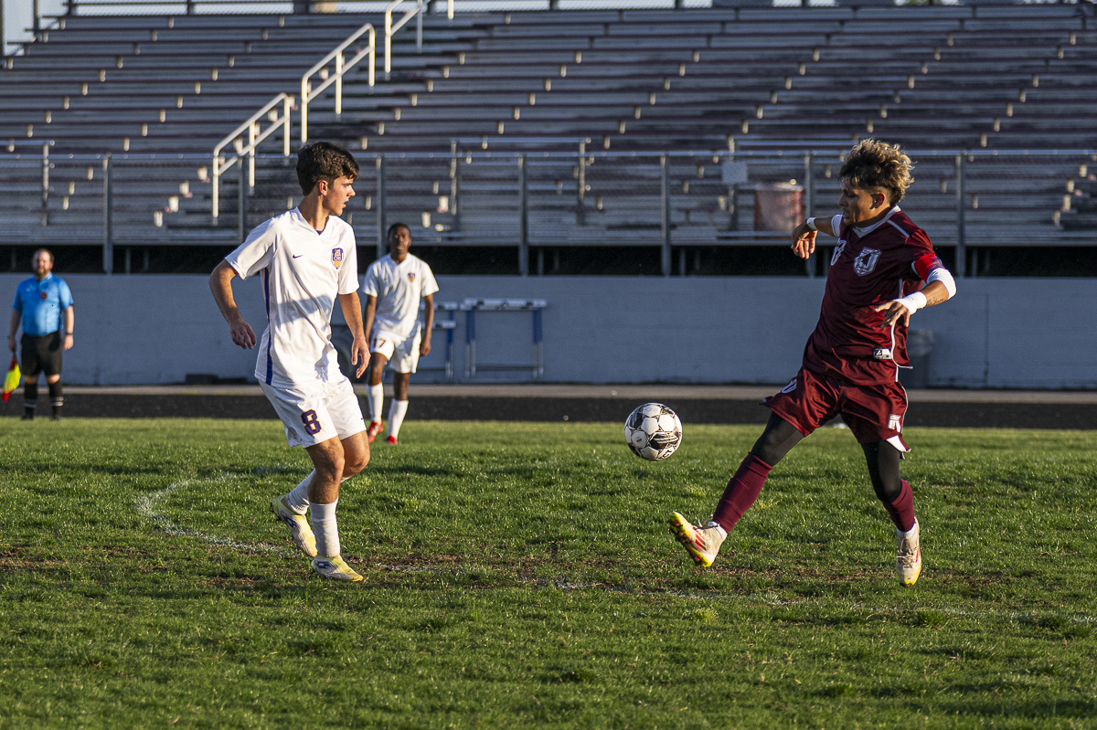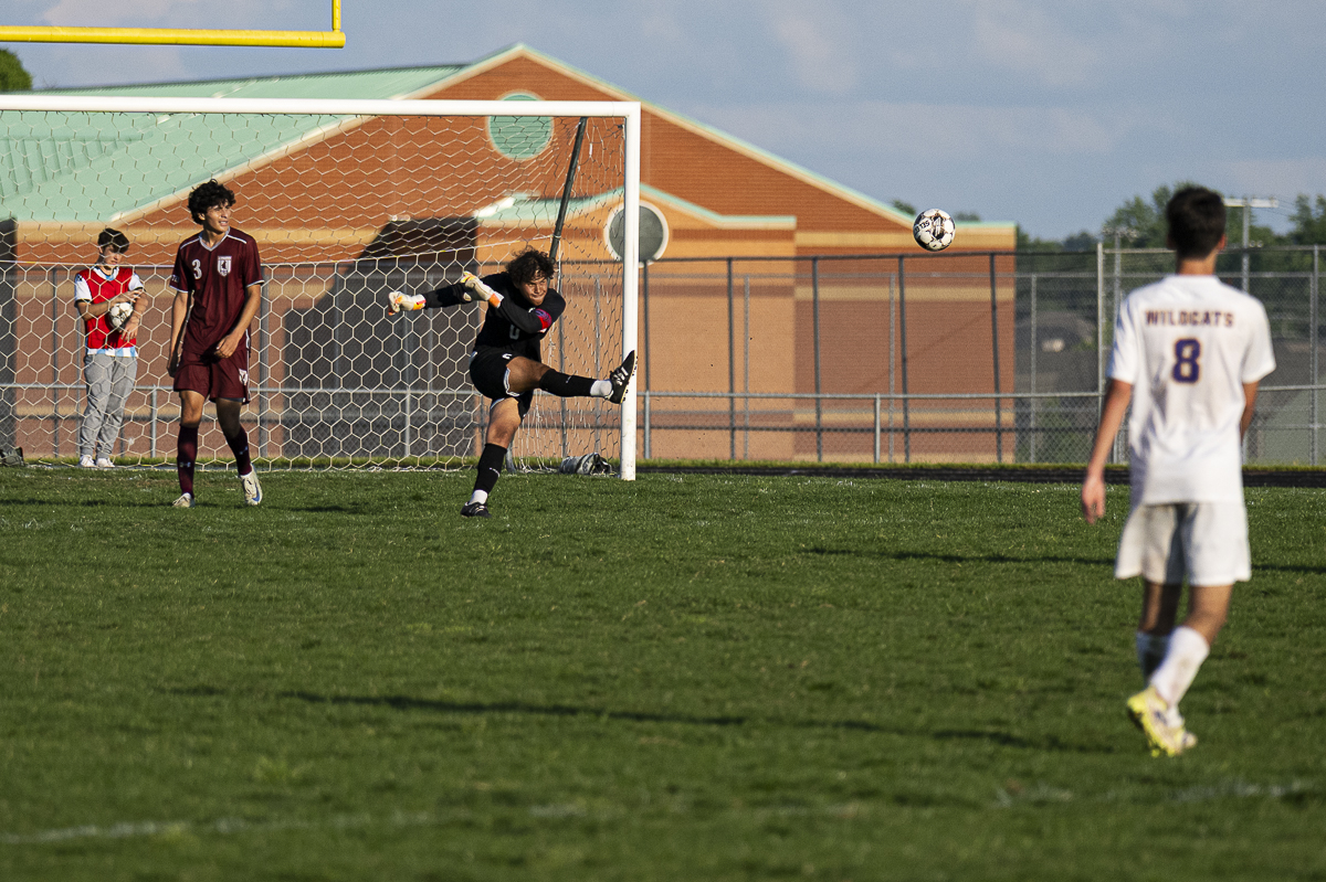 #9 Antonio Cowen of the West Creek Coyotes kicks the ball downfield against the Clarksville High school Wildcats in the Regional Semifinals on May 13, 2025 (Jeff Danault)