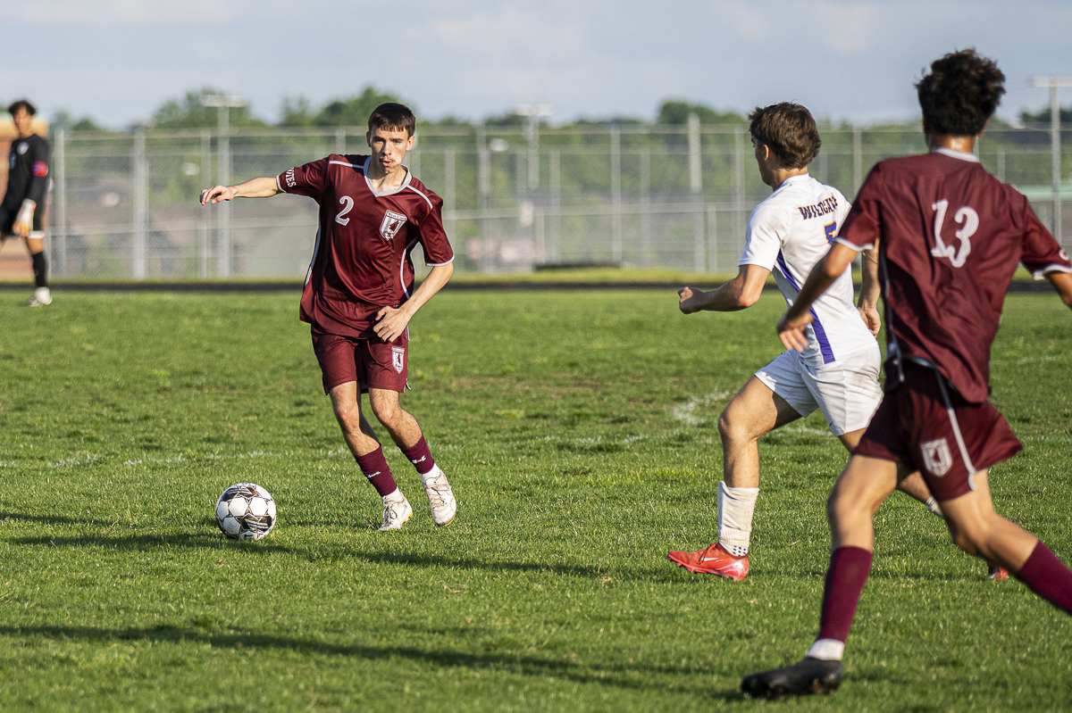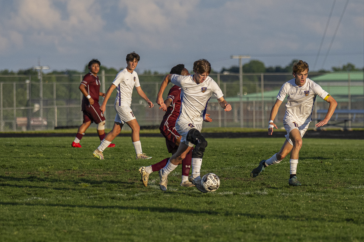 #2 Lucas Drier of the West Creek Coyotes moves the ball downfield against the Clarksville High school Wildcats in the Regional Semifinals on May 13, 2025 (Jeff Danault)