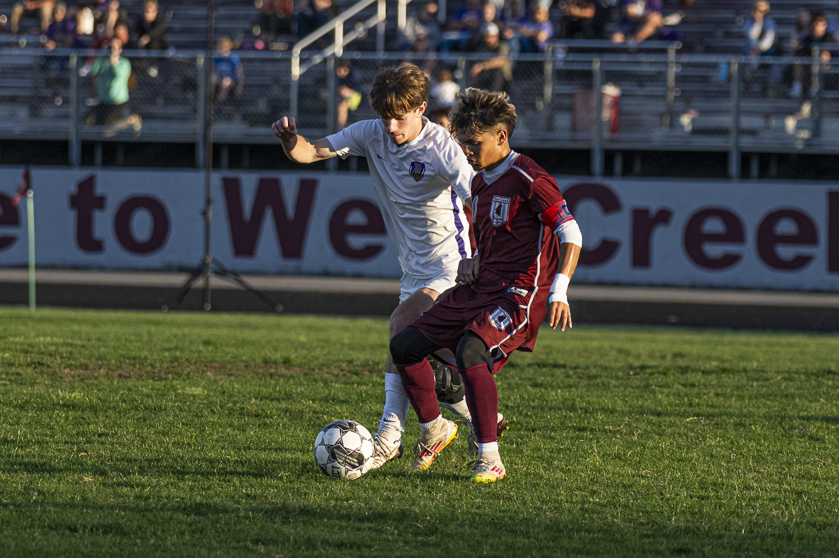 #2 Hudson Black of the Clarksville High school Wildcats defends the ball from the West Creek Coyotes in Regional Semifinals on May 13, 2025 (Jeff Danault)