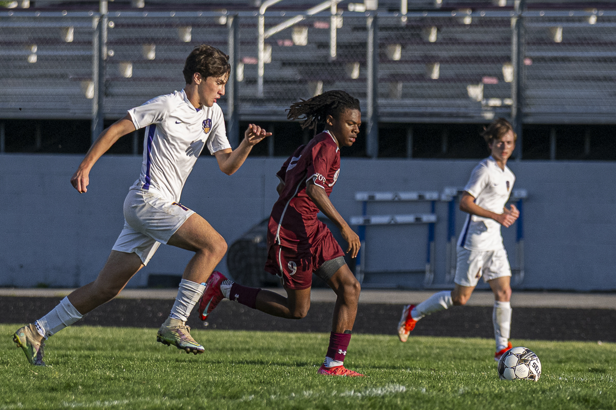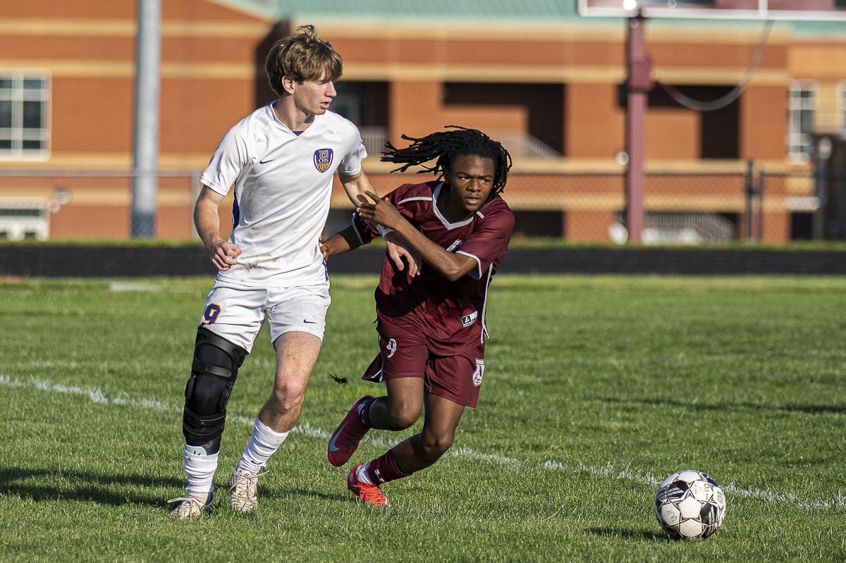 #9 Antonio Cowen of the West Creek Coyotes races for ball control against the Clarksville High school Wildcats in the Regional Semifinals on May 13, 2025 (Jeff Danault)