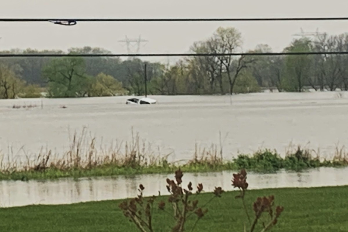 A truck is partially submerged near the Reserve at Kirkwood apartments during flooding on April 6, 2025. (Ryan Ploeckelman)