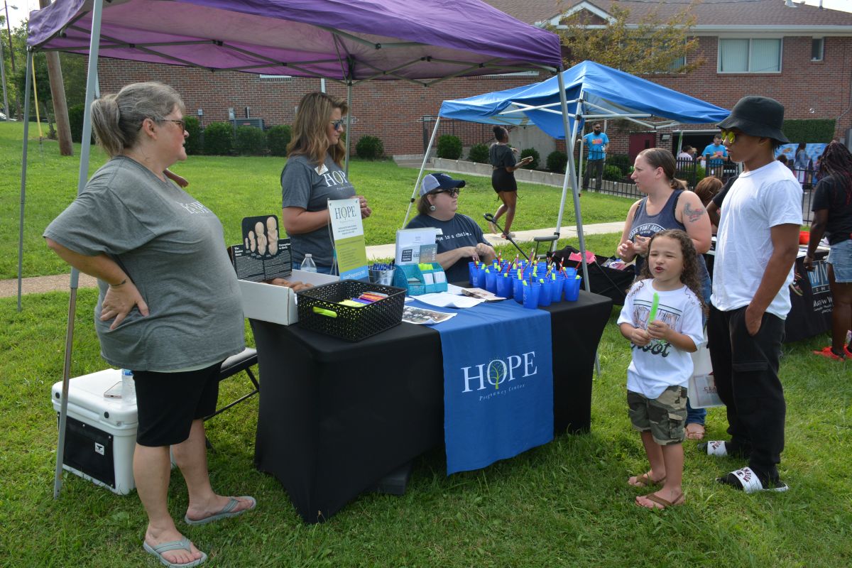 Volunteers and visitors at the Clarksville Housing Authority Back to School Bash at Summit Heights on Jul. 25, 2023. (Lee Erwin)