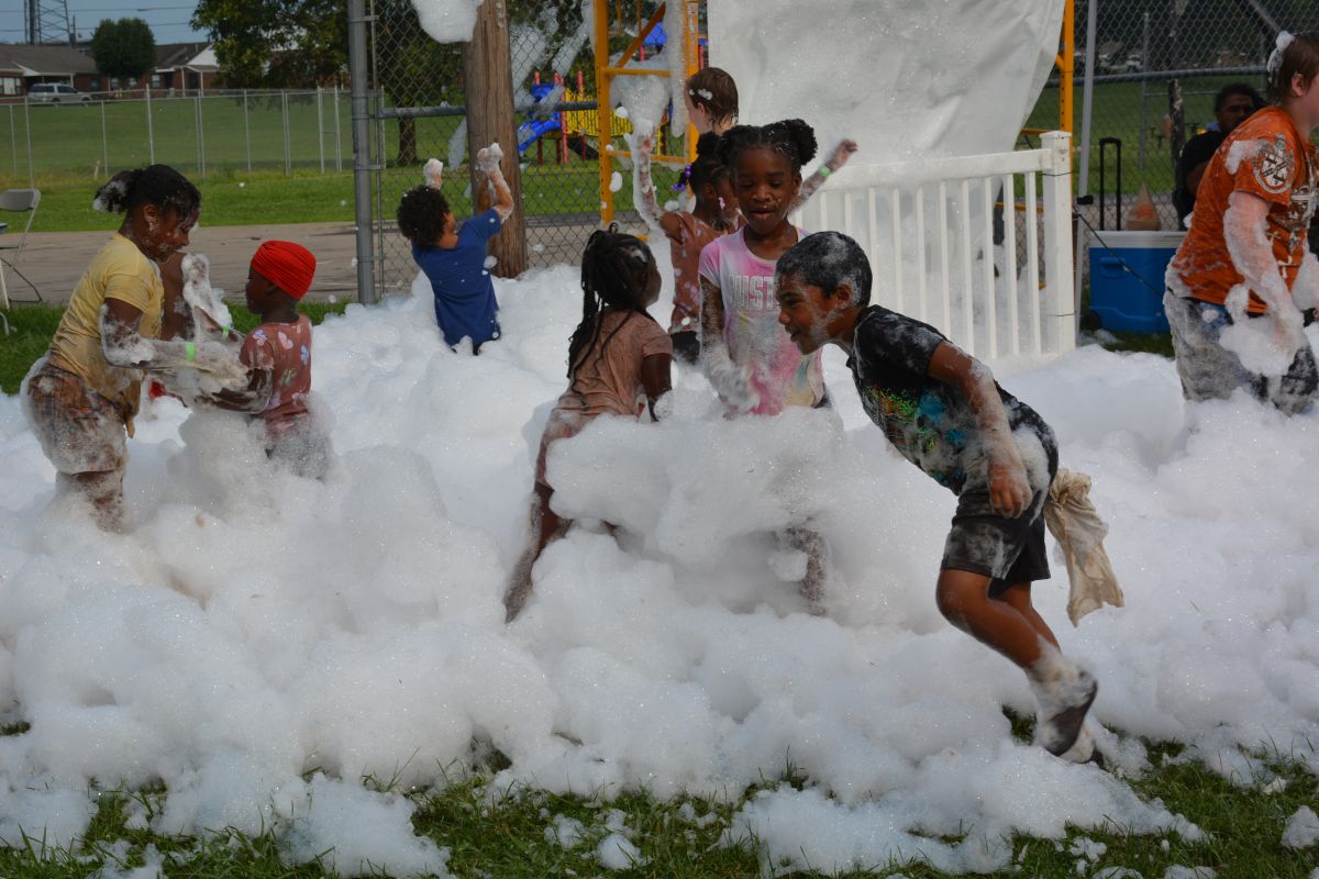Children playing in the foam at the Clarksville Housing Authority Back to School Bash at Summit Heights on Jul. 25, 2023. (Lee Erwin)