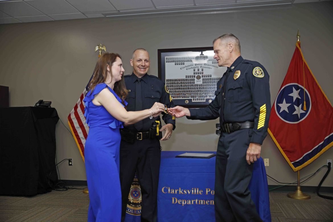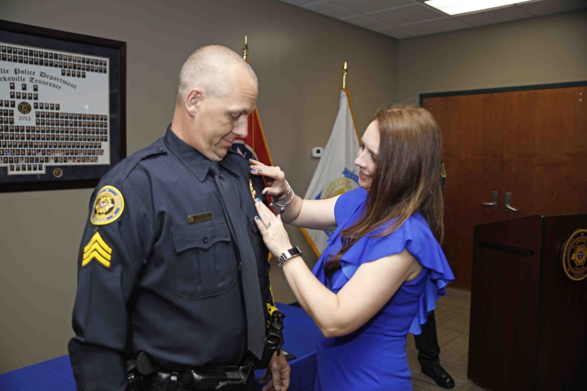 CLARKSVILLE, Tenn. (CLARKSVILLENOW) – K-9 Officer Joseph “Joey” Scruggs was promoted to the rank of Sergeant in front of a room filled with friends and well-wishers this week.