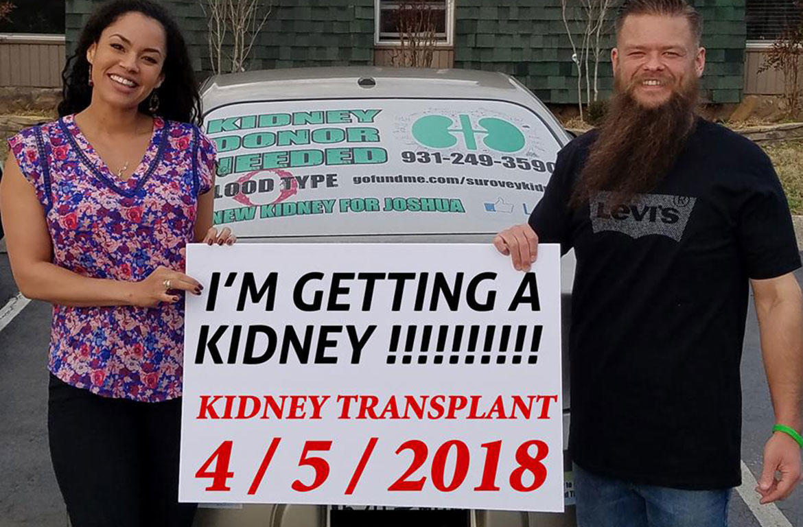 Joshua’s doctor put him on dialysis in 2012, and by May 2015 he qualified for an organ transplant. He lost a significant amount of weight to improve his health and created a Facebook page in his quest for a new kidney. He used money from a crowd sourcing campaign to purchase car decals, signs, and even a billboard on Riverside Dr. to get the word out to the public about his need.