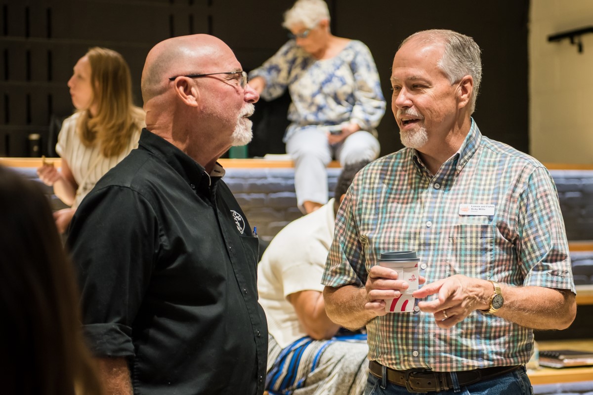 Ken Shipley, left, with Manna Cafe, chats with Ricky Willis of Loaves & Fishes during the Clarksville-MoCo Non Profit Education Conference on July 19 at The Press. (Jon Duncan Photography)