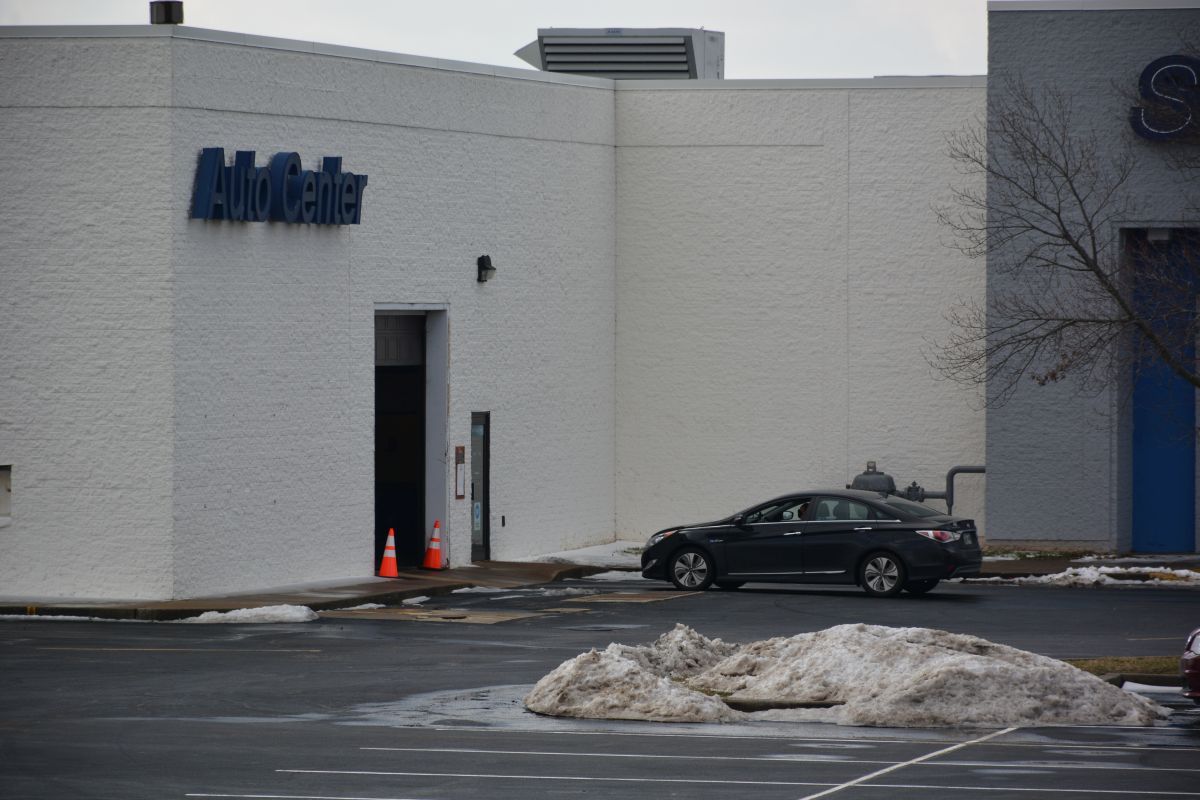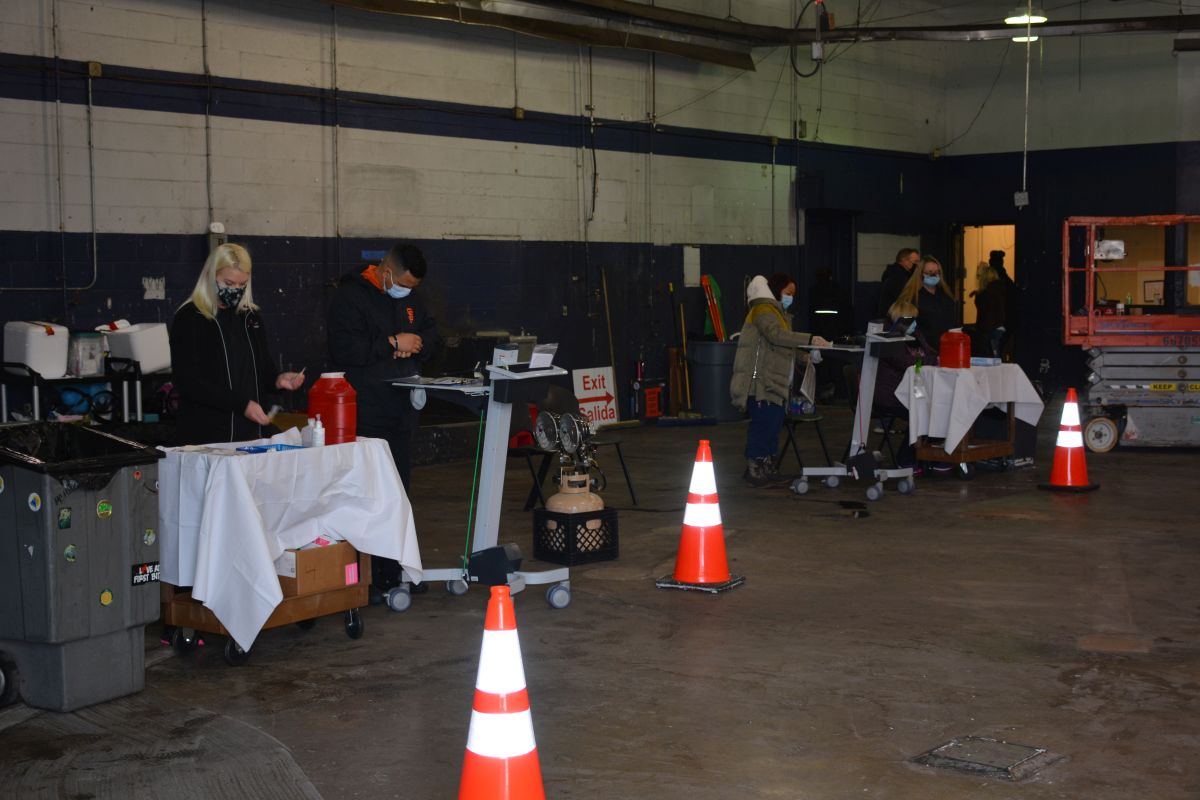 The line moved steadily along the rear roadway of the mall and then wound through the parking lot into the former automotive garage.