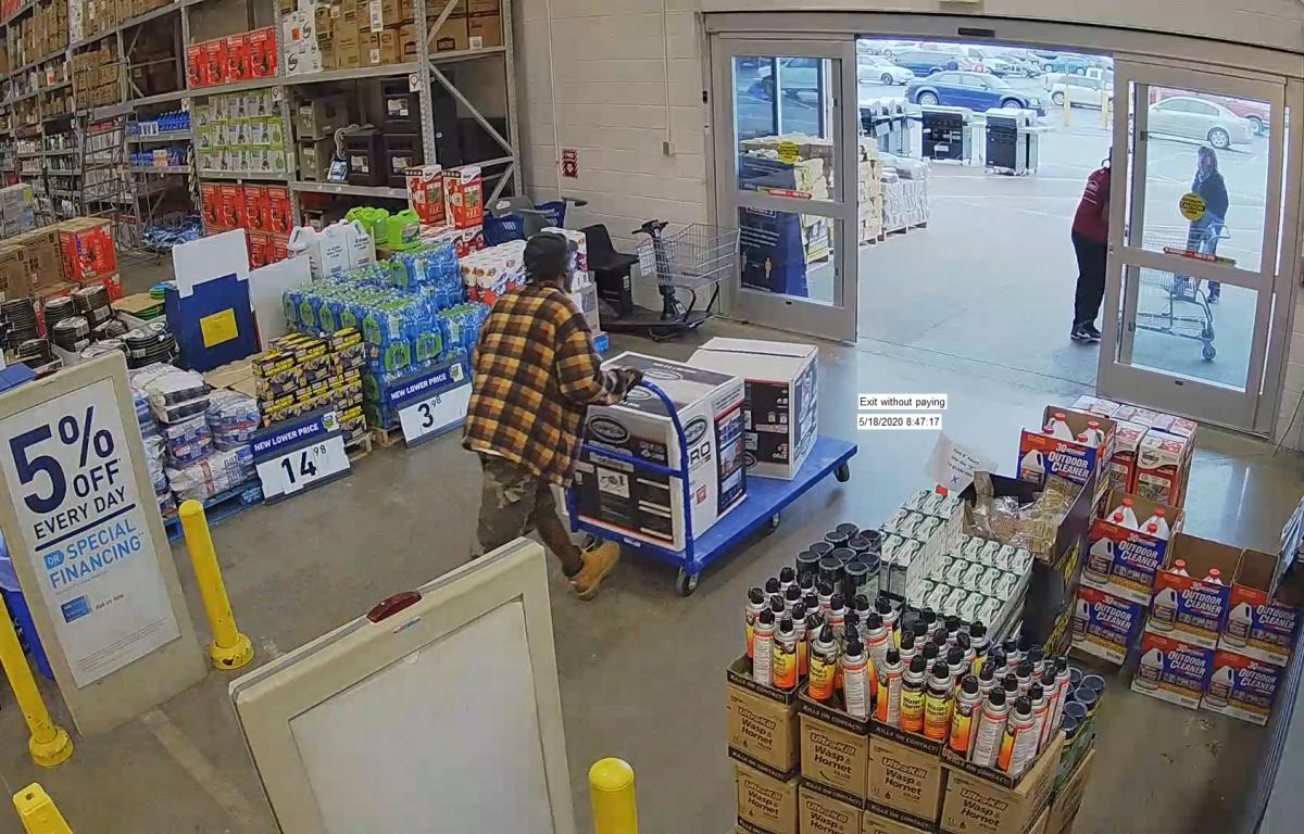 On May 18, 2020 at 8:36 am, a black male in his 40’s came into Lowes and walked out with two pressure washers without paying for them. The pressure washers are valued at approximately $1,500.