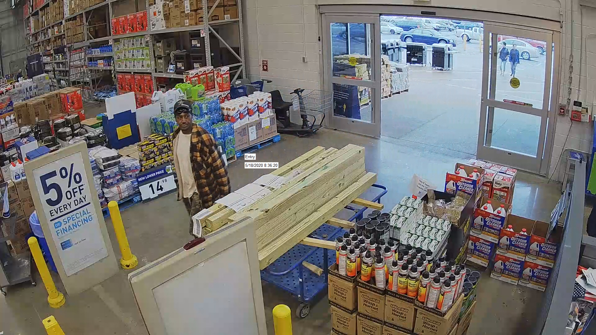 On May 18, 2020 at 8:36 am, a black male in his 40’s came into Lowes and walked out with two pressure washers without paying for them. The pressure washers are valued at approximately $1,500.