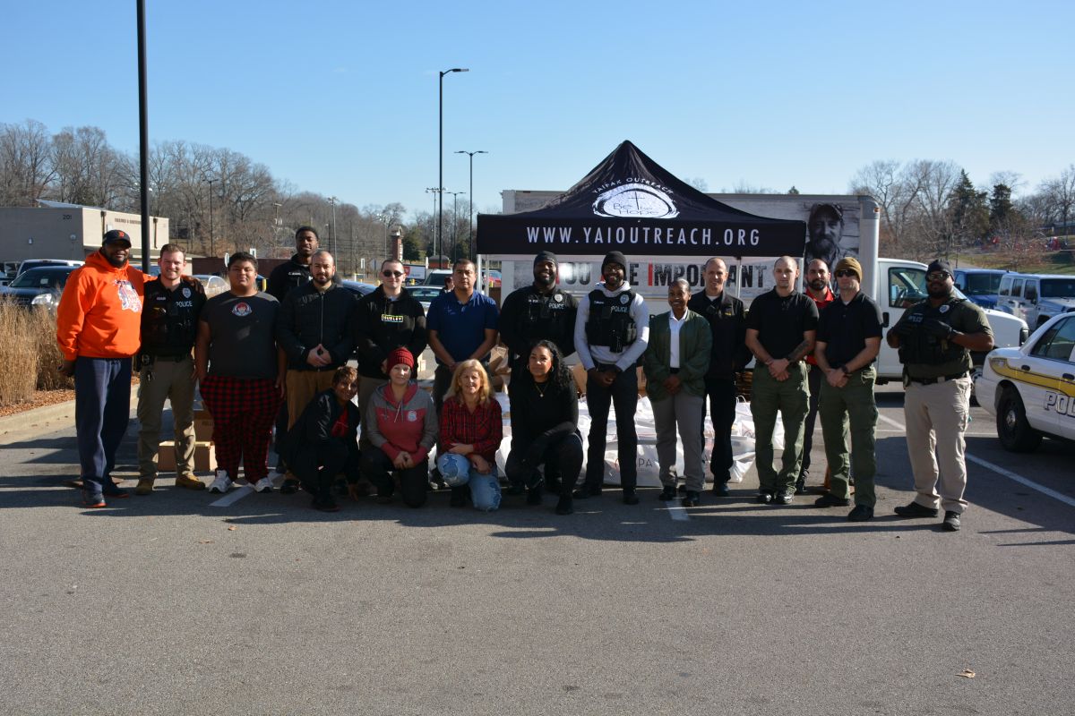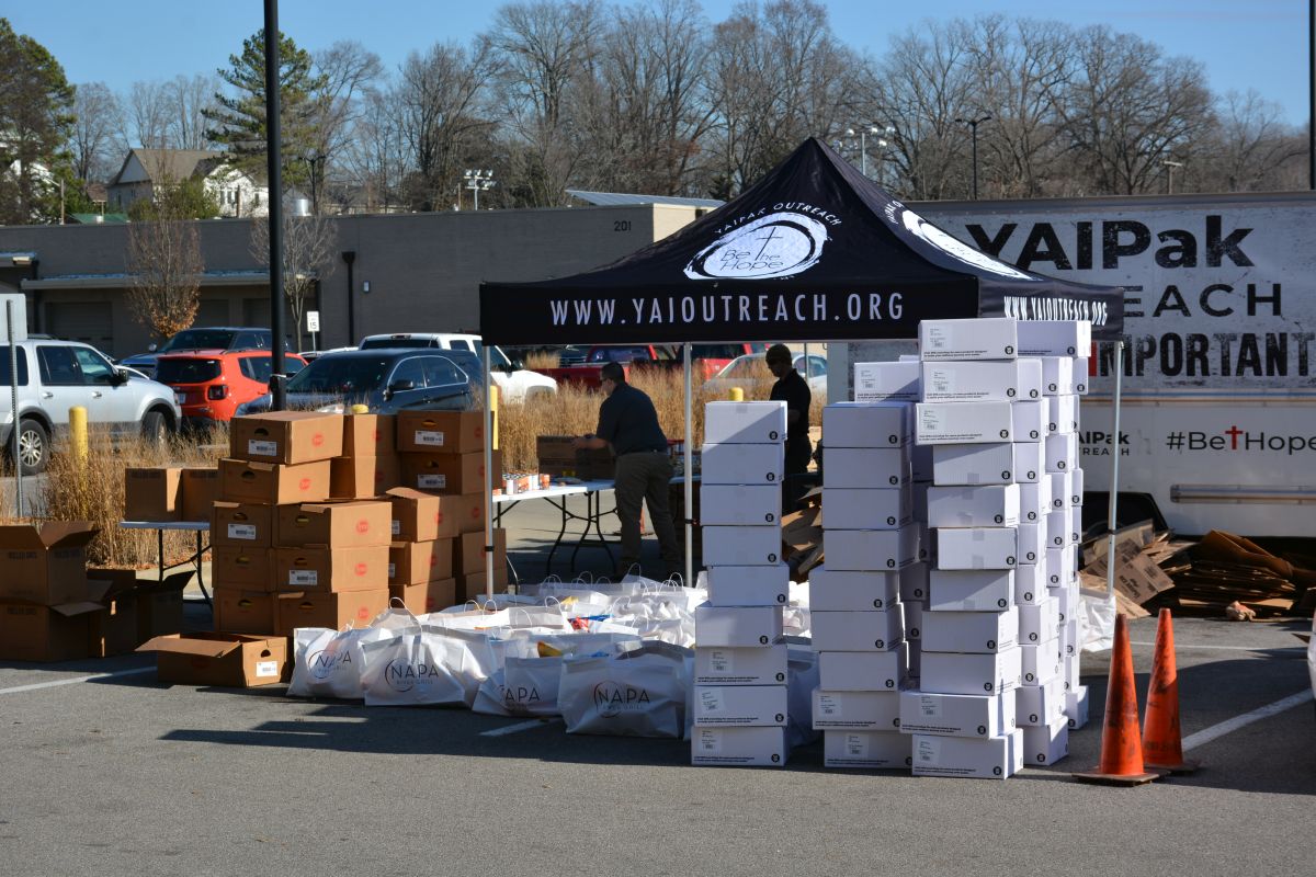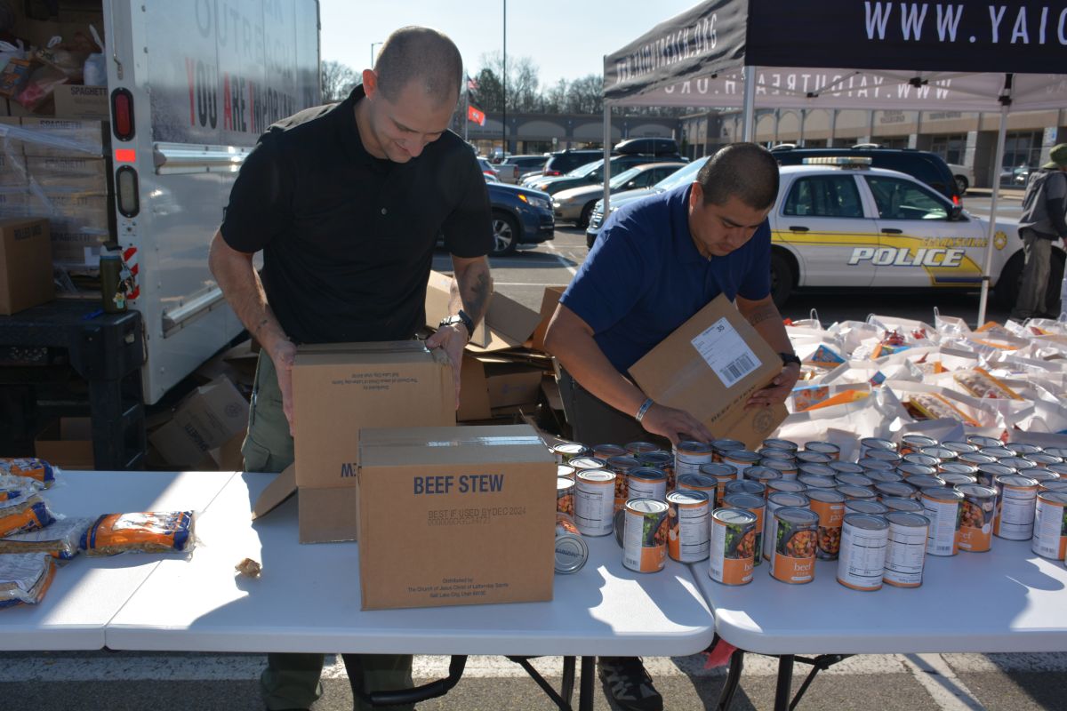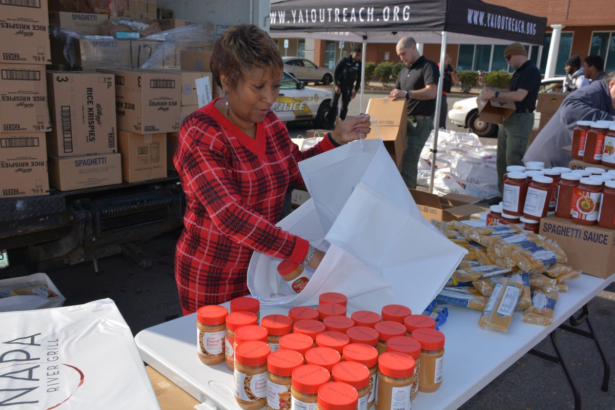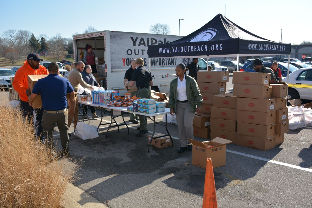 YAIPak Outreach, Manna Café Ministries, Clarksville Urban Ministries and Clarksville Police officers were at Veterans Plaza outside the Clarksville-Montgomery County Public Library, passing out boxes and bags of food to those in need.