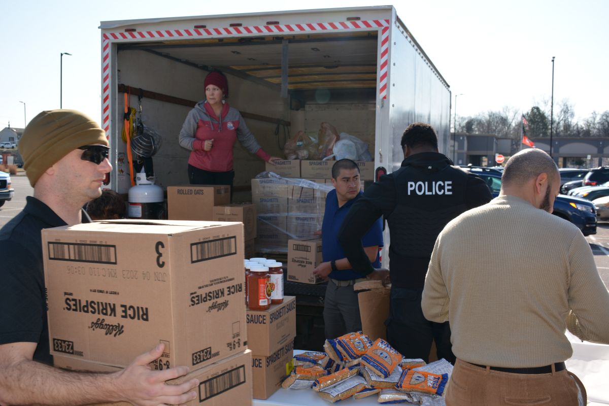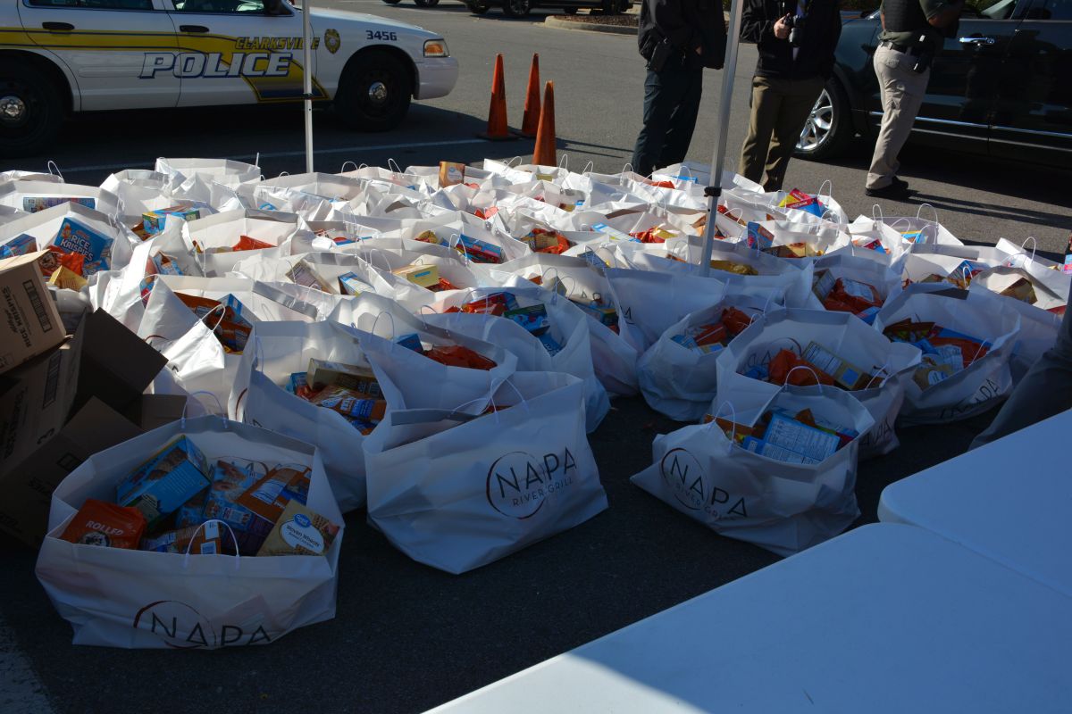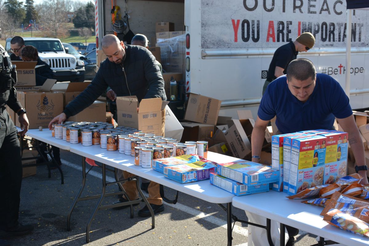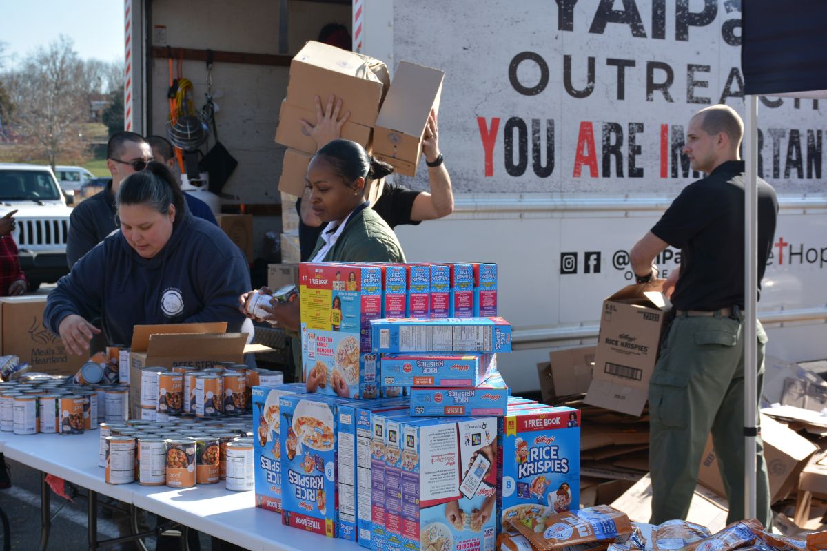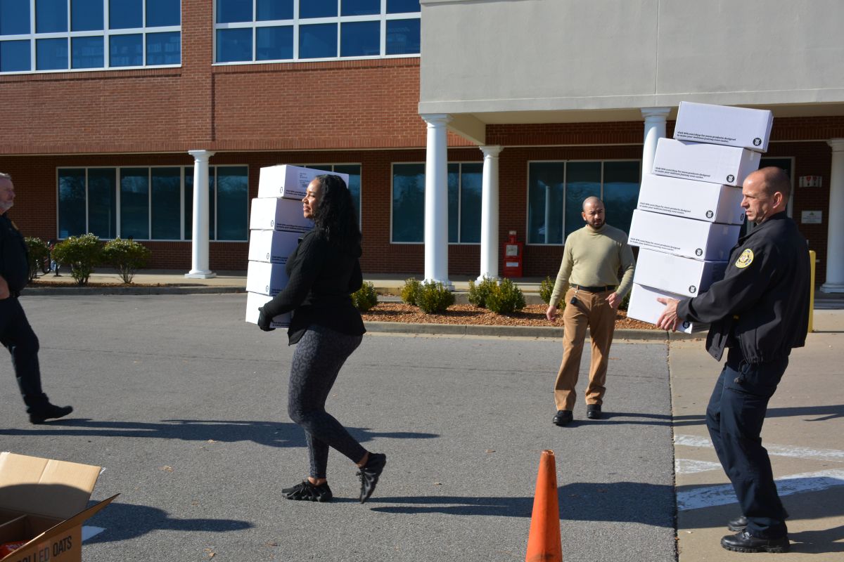 YAIPak Outreach, Manna Café Ministries, Clarksville Urban Ministries and Clarksville Police officers were at Veterans Plaza outside the Clarksville-Montgomery County Public Library, passing out boxes and bags of food to those in need.