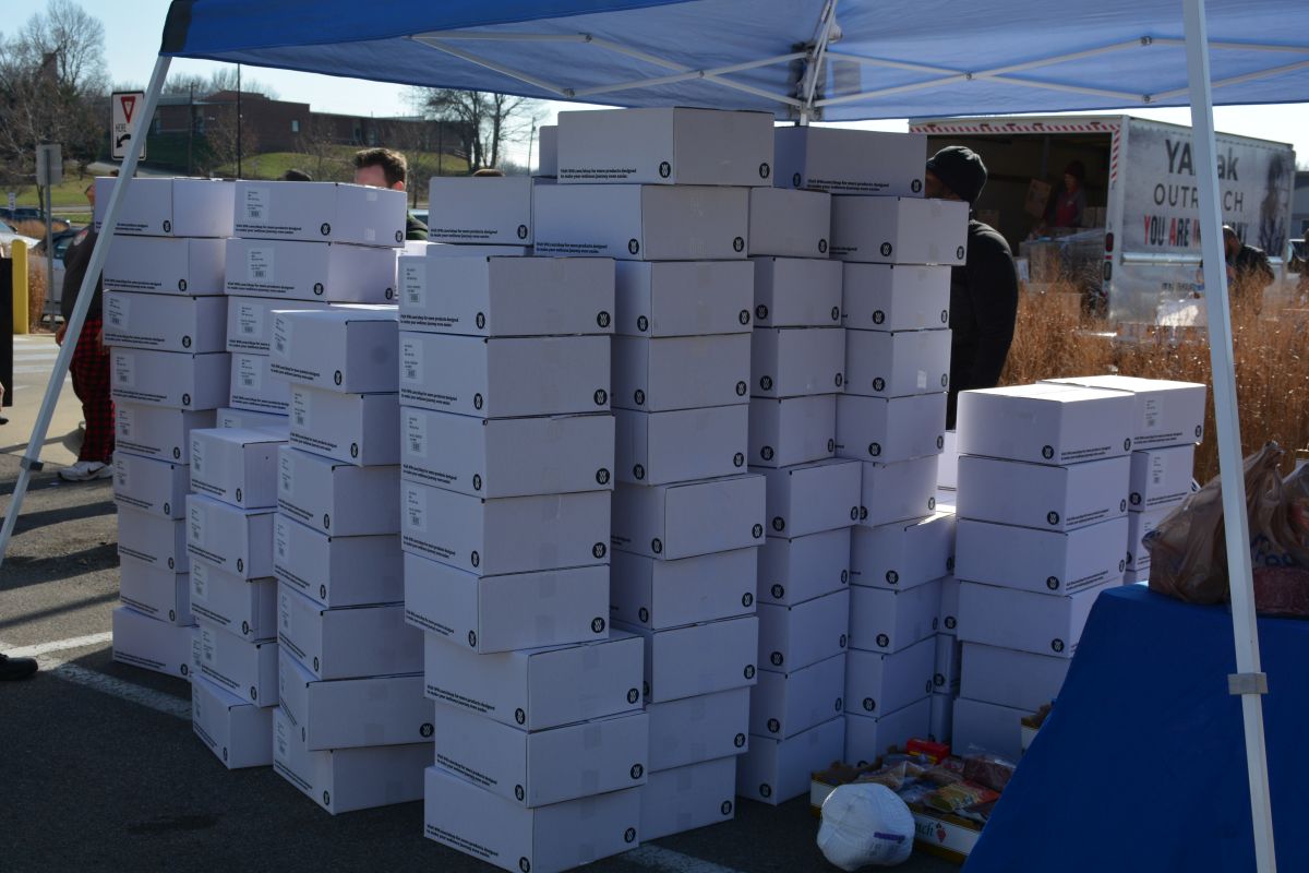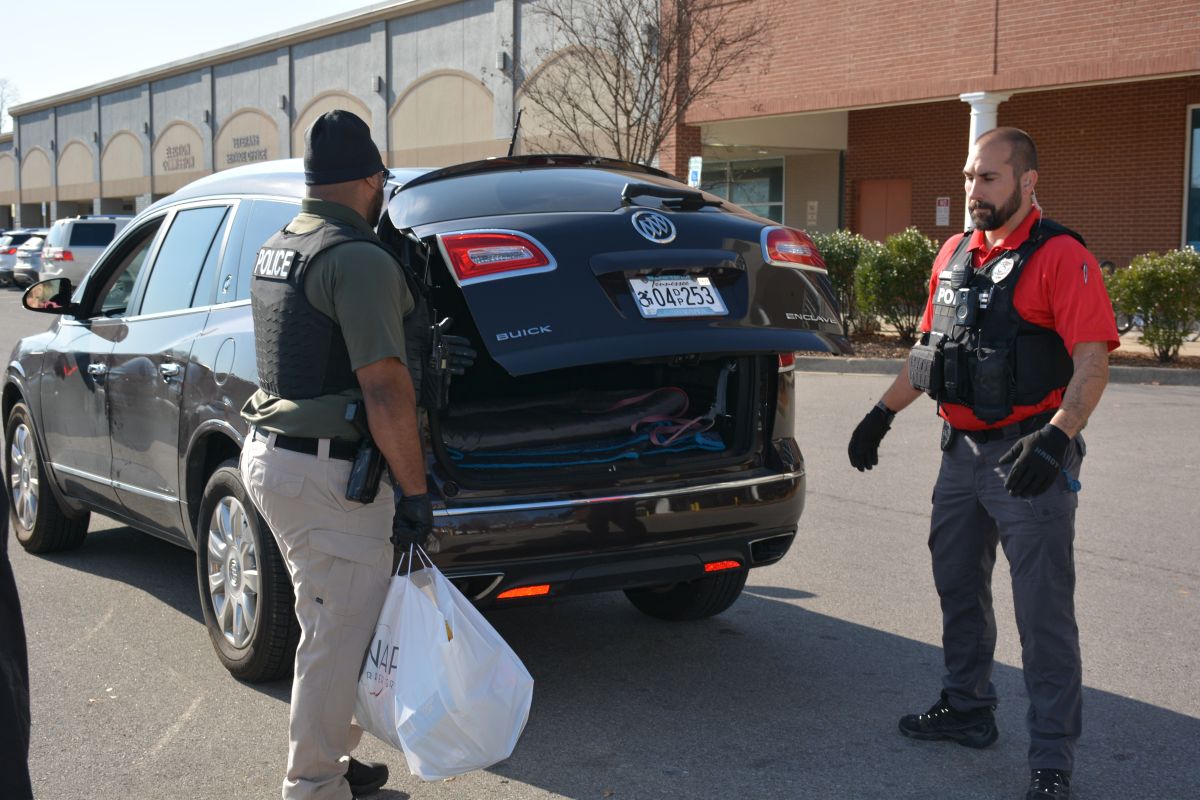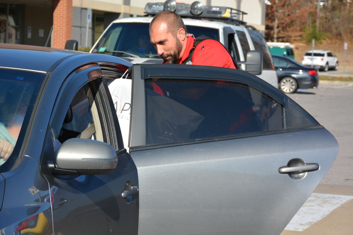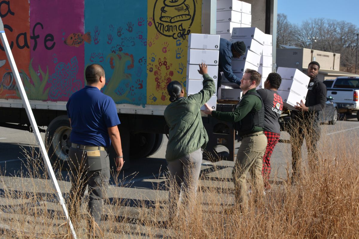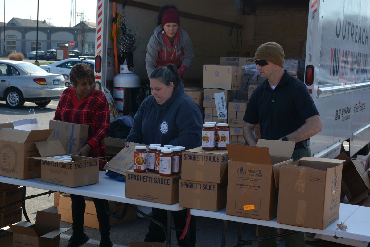 YAIPak Outreach, Manna Café Ministries, Clarksville Urban Ministries and Clarksville Police officers were at Veterans Plaza outside the Clarksville-Montgomery County Public Library, passing out boxes and bags of food to those in need.