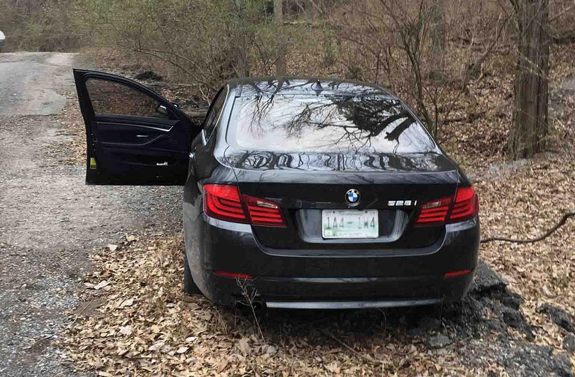Police spokesman Jim Knoll said two suspects fled the scene of a home invasion in the 800 block of Biglen Rd. in a stolen BMW before ditching the vehicle near the Vulcan Plant rock quarry off Providence Blvd.