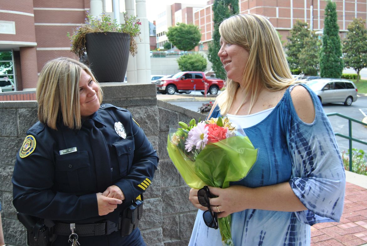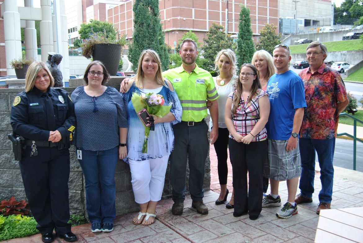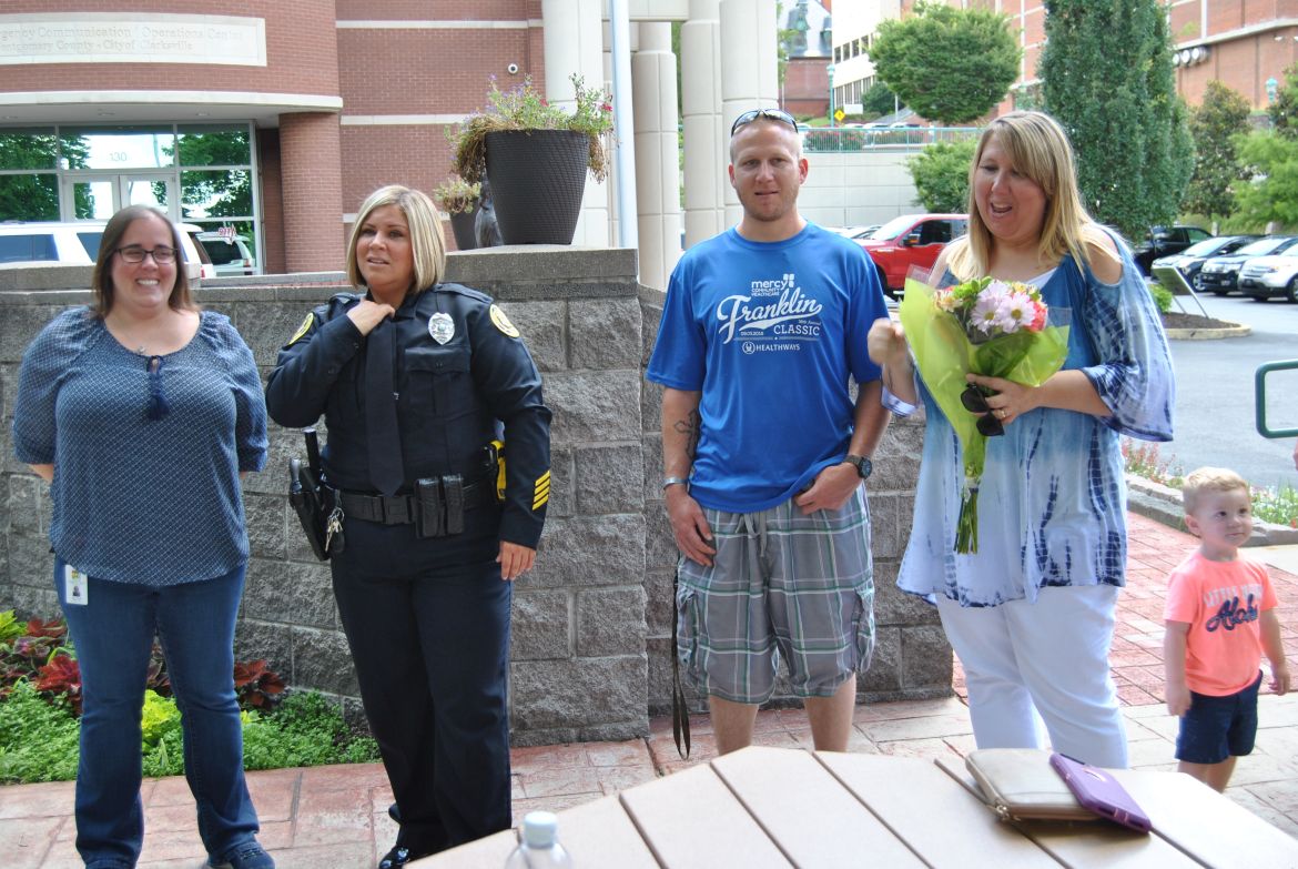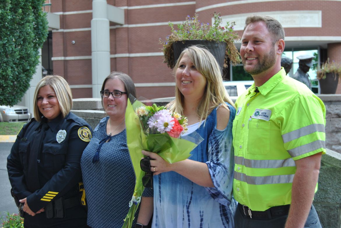 CLARKSVILLE, Tenn. – (CLARKSVILLENOW) A Clarksville woman, Kelly Plummer, along with her family, were at the Clarksville Police Department Monday to thank the people who helped rescue her when she collapsed June 5 on Sandpiper Drive after she quit breathing. Plummer was passed out in the middle of the street when she was discovered by Ray Davidson, a driver for Waste Industries.