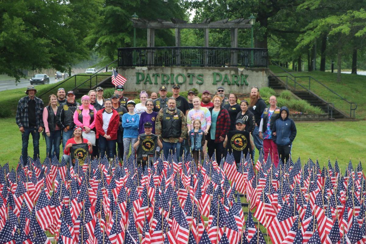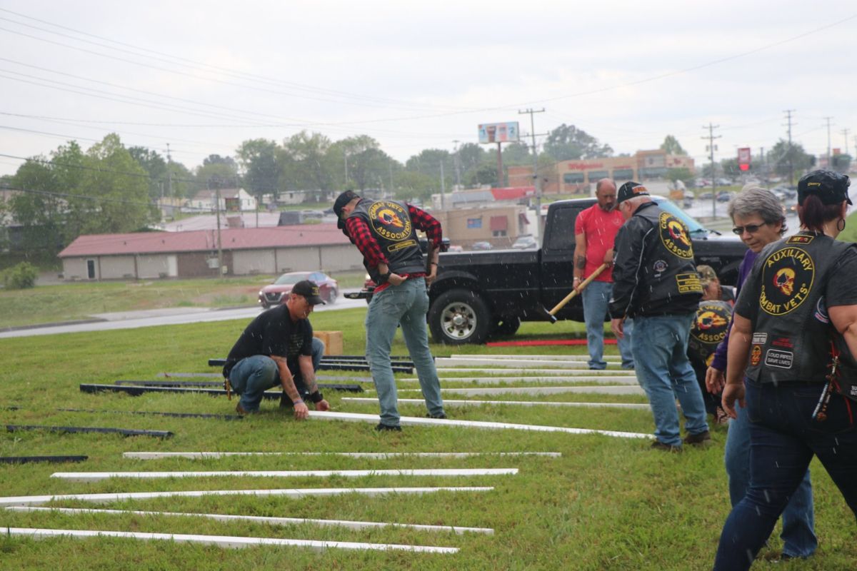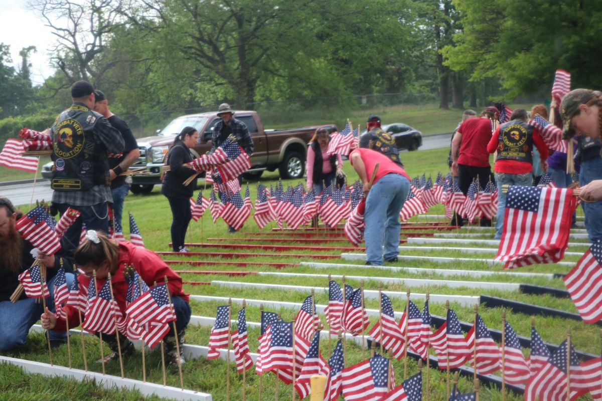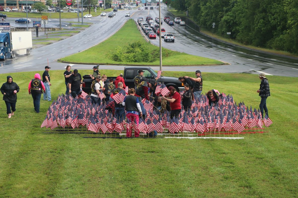 CLARKSVILLE, Tenn. (CLARKSVILLENOW) – In the pouring rain Thursday, the Combat Veterans Motorcycle Association 18-2 placed American flags for Fort Campbell’s fallen Soldiers since 9/11/2001 at Patriots Park on Fort Campbell Blvd. The flags will be on display for Memorial Day and will be retired on Wednesday, May 27.
