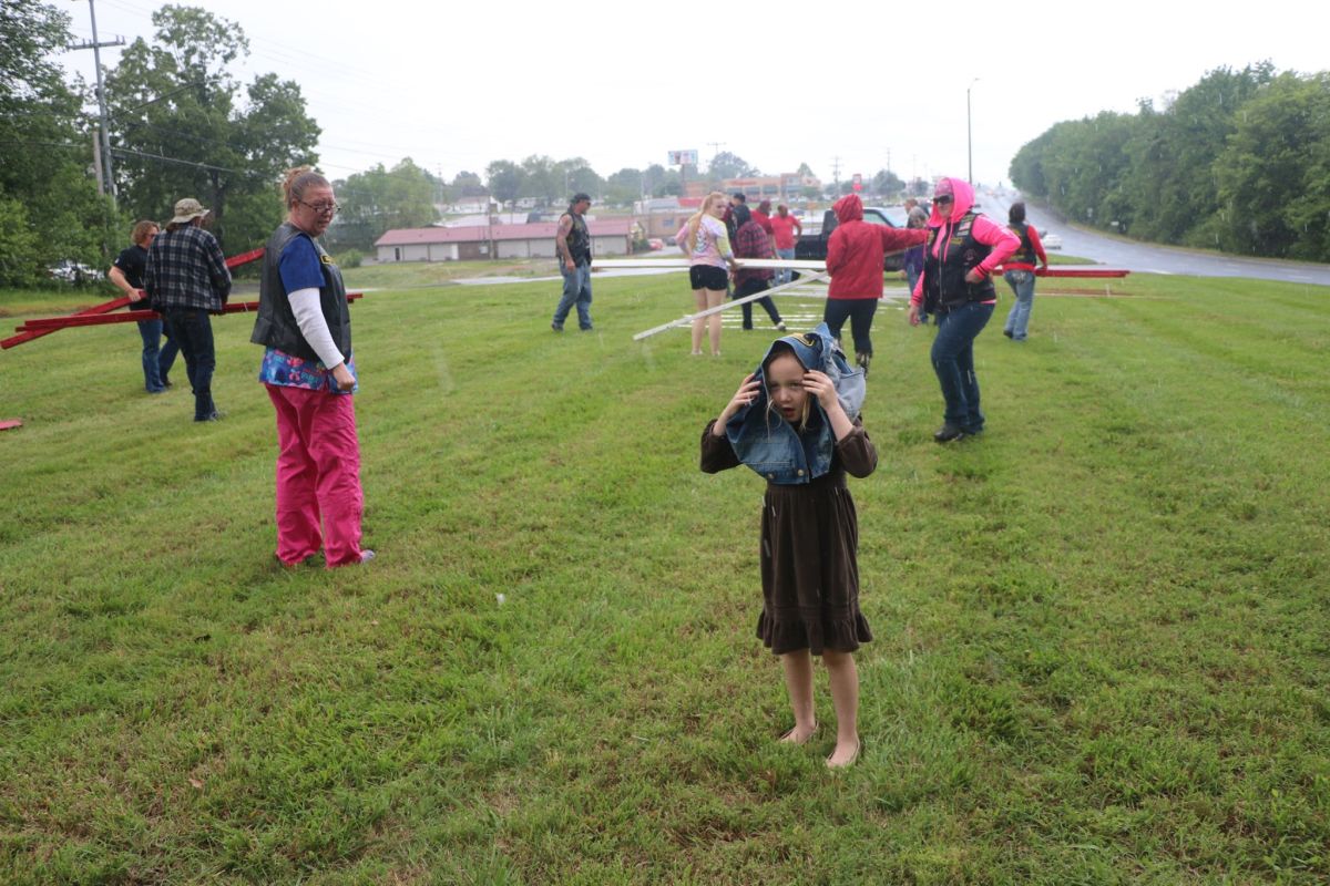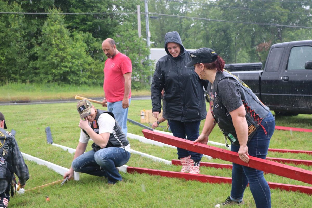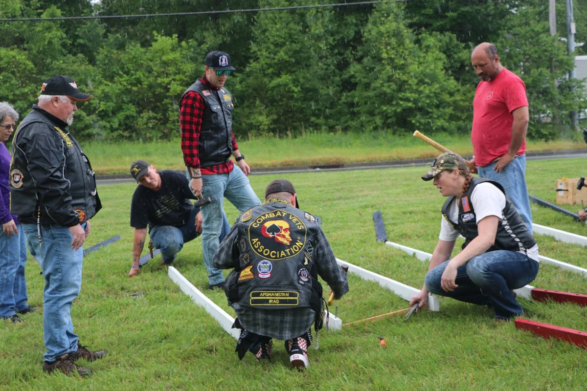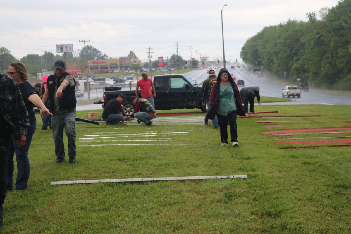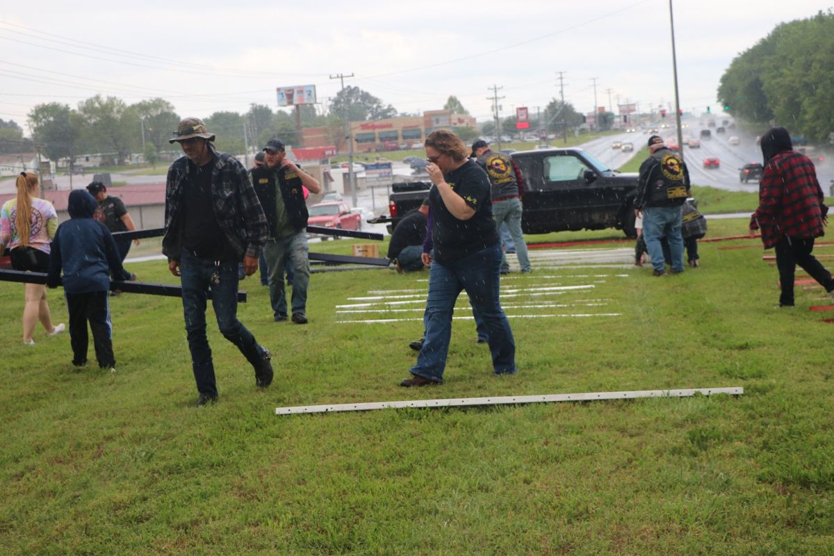 CLARKSVILLE, Tenn. (CLARKSVILLENOW) – In the pouring rain Thursday, the Combat Veterans Motorcycle Association 18-2 placed American flags for Fort Campbell’s fallen Soldiers since 9/11/2001 at Patriots Park on Fort Campbell Blvd. The flags will be on display for Memorial Day and will be retired on Wednesday, May 27.