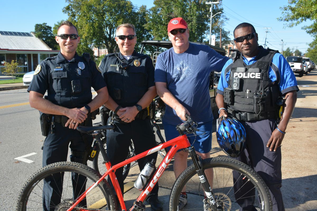 Clarksville Police Officers join a citizen as they prepare to ride in Clarksville’s first Community Bike Ride hosted by Clarksville Parks & Recreation on Sat October 16 2021 (Lee Erwin).