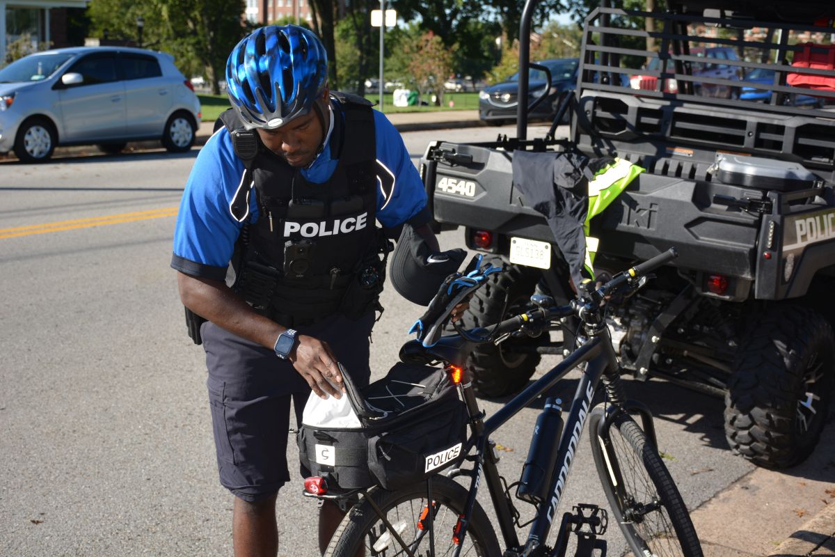 A Clarksville Police Officer checks out his bicycle before the city’s first Community Bike Ride with Clarksville Parks & Recreation on Sat. October 16 2021. (Lee Erwin).