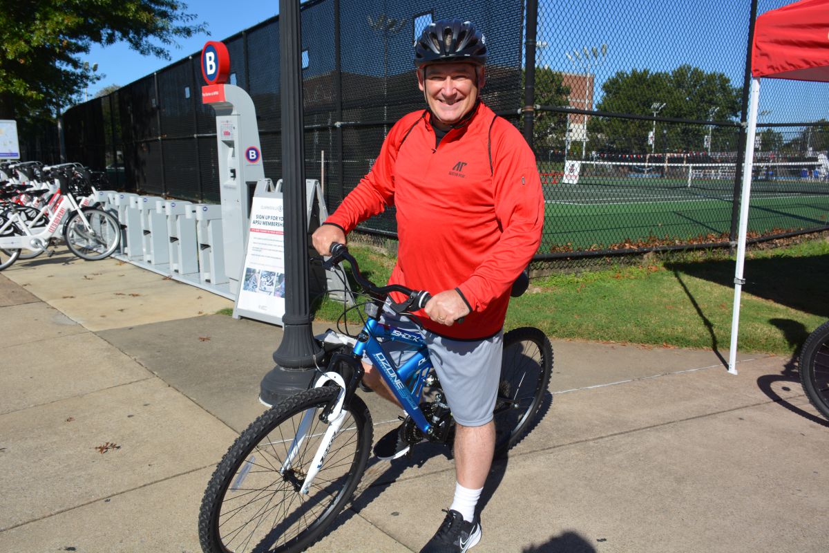 APSU President Dr. Michael Licari prepares to ride in Clarksville’s first Community Bike Ride hosted by Clarksville Parks & Recreation on Sat October 16 2021 (Lee Erwin).