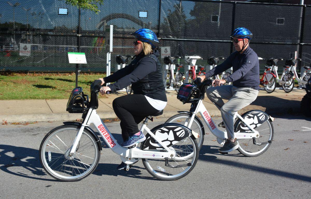 Clarksville Mayor Joe Pitts and First Lady Cindy Pitts ride Clarksville B-Cycles in the city’s first Community Bike Ride on Sat. October 16 2021 (Lee Erwin).
