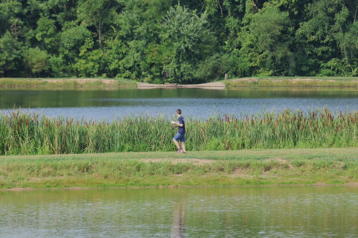 Some pairs, some groups of three or four, lined the banks of the pond. Mason Ulrick made his way to the far side, looking for a sweet spot. Darryl Wells fished with his Godson Brycen.